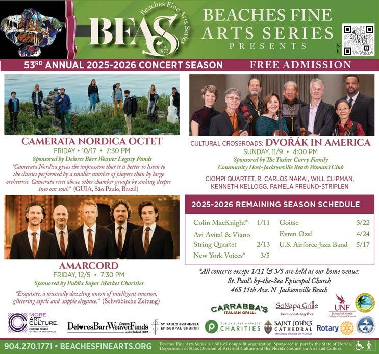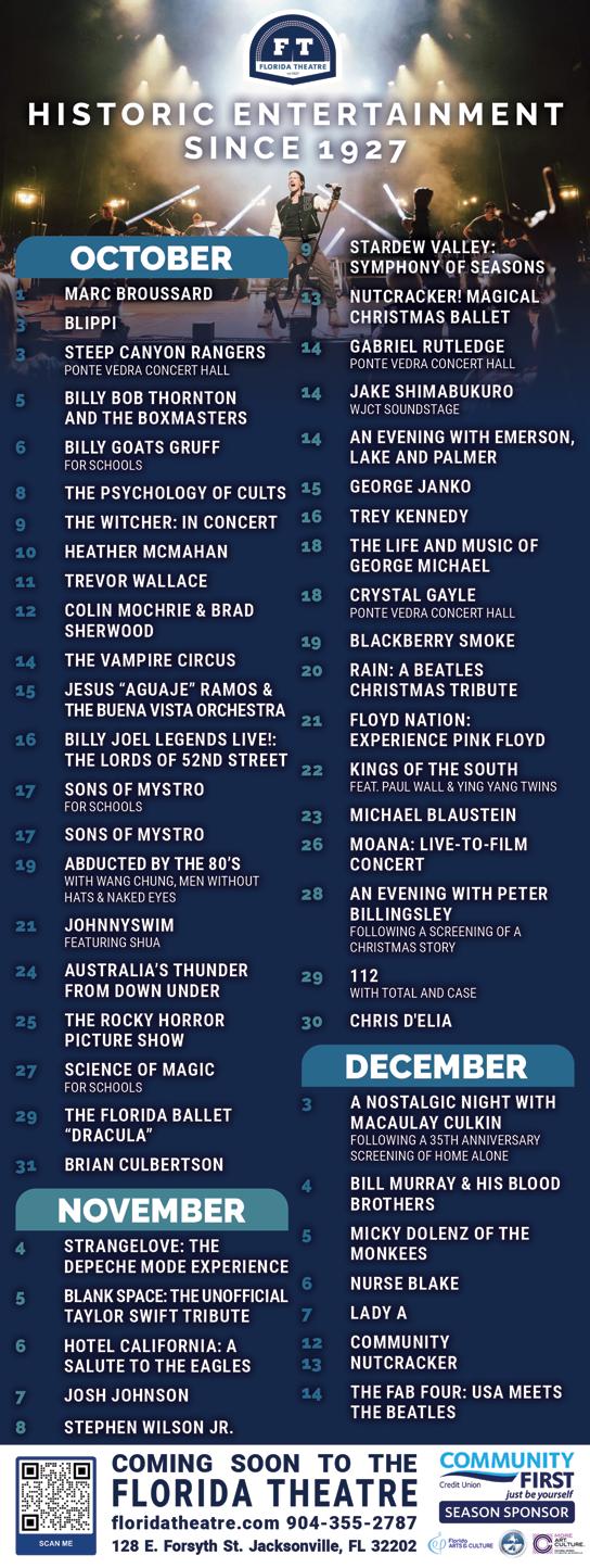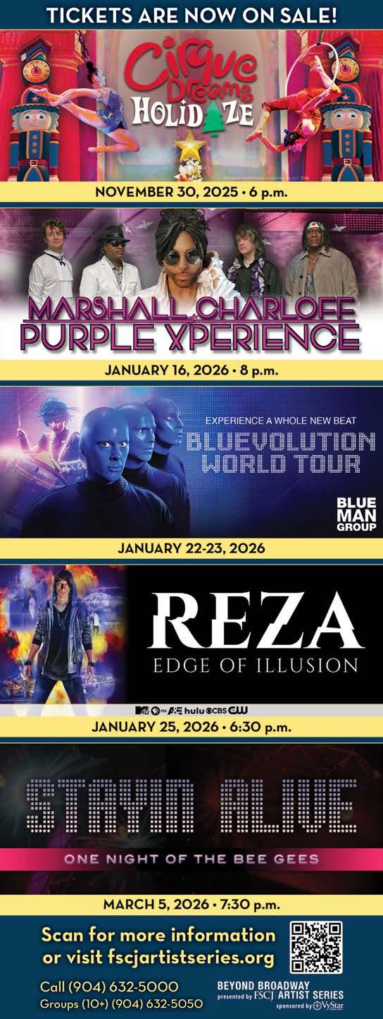 Fact is, the state and our slice of Northeast Florida embrace the arts in many forms—as evidenced by our annual compilation of upcoming concerts, gallery openings, musicals, dramas and more featured in the issue you now hold. Autumn is the season when the region’s creative community truly springs to life, with hundreds of artistic happenings packing the calendar and filling museums, theaters and schools from Amelia Island to St. Augustine. So, get out there and enjoy it. There’s a new favorite song, play or painting waiting to be discovered. u