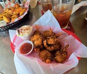 Don’t let the Harley Davidson’s parked out back dissuade you from entering Lou’s Blues, a ramshackle bar and grill in the oceanside town of Indialantic, just north of Melbourne Beach. It’s a favorite pitstop for bikers motoring along this stretch of Hwy. A1A, and has been for more than 20 years. Ever watched the Patrick Swayze bar-fighting classic Road House? Lou’s would be a fantastic location for another remake—not that barroom brawls are a problem here. The twostory establishment is part restaurant and live music venue. The interior decor is a kaleidoscope of colors and kitsch, beer signs, boar’s heads, and brassieres. Smoked wahoo dip with jalapeños, Philly steak sandwiches, Italian sausages with peppers and onions, fried chicken wings smothered in pineapple teriyaki sauce ($15) chili cheese fries, 12-inch cheese pizza ($14)—the menu has all your bar eats favorites. Plus, being only yards from the beach, Lou’s also serves seafood standards like conch fritters ($12), raw and steamed oysters, and a seafood platter ($43) with snow crab legs, peel-and-eat shrimp, and a crab cake. Don’t judge this book by its cover. u