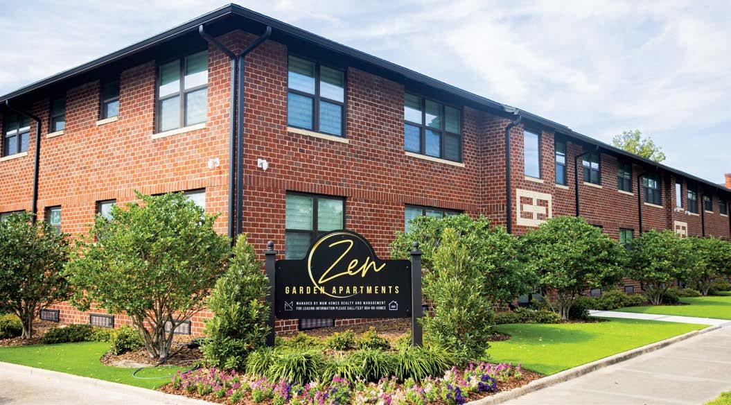 The outdoor space at Zen Garden Apartments is a true standout feature. What was once an uninviting patch of broken concrete and weeds has been transformed into a vibrant gathering space for residents. The courtyard is divided into several distinct outdoor “rooms,” each designed for a specific purpose. A majestic existing tree was preserved, while mature trees and native bushes were added to create a lush, green oasis. A spacious shaded deck, a gazebo and a kitchen with a wet bar make the courtyard an ideal spot for cookouts, s’mores, parties, and even mini golf tournaments. Residents also enjoy regular outdoor yoga classes led by local instructors from Bold City Yoga Studio.