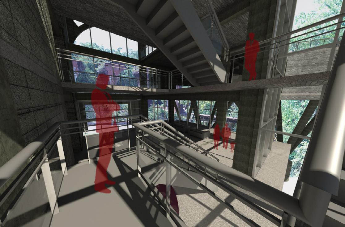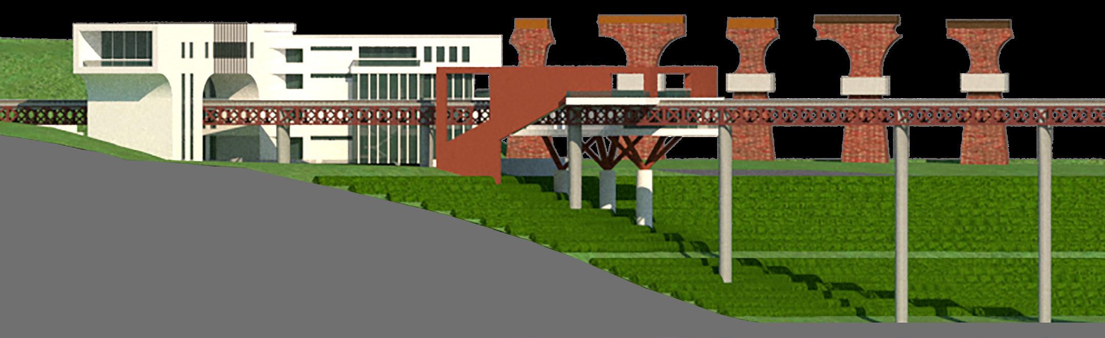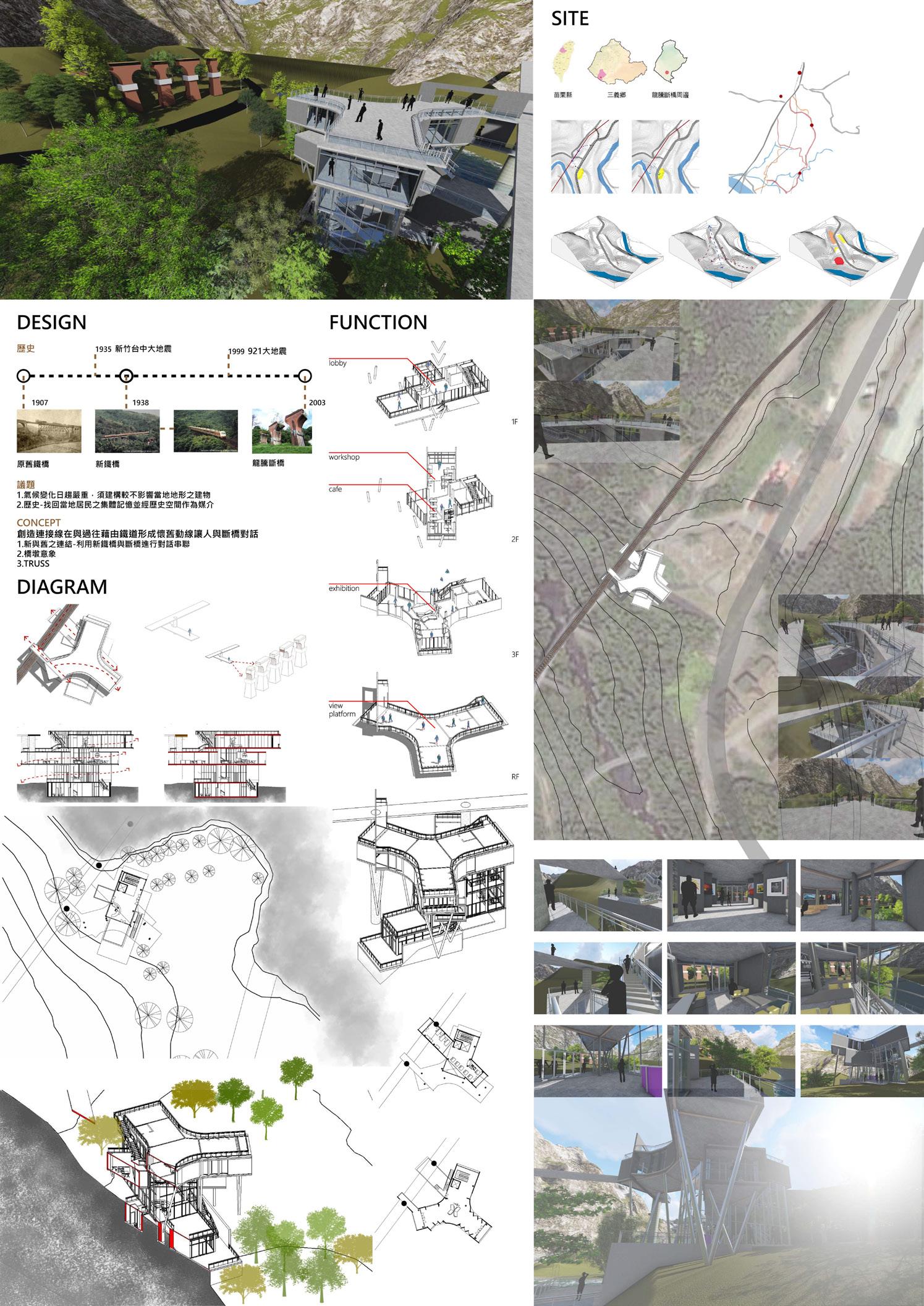 41 龍騰 The Rising Bridge 2017_大三 龍騰斷橋對於舊鐵道文化具有深度的文化價值,他經歷了 各種天災的侵襲,依然屹立在此地,全台灣還保留許多舊 鐵路路線,此設計也希望結合路線讓舊鐵路活化使用,使 其形成一條步道,讓人體驗甚至細觀察鐵路的由來與歷史。 Location : Maioli Taiwan Year : 2017 Type : Culture Center design