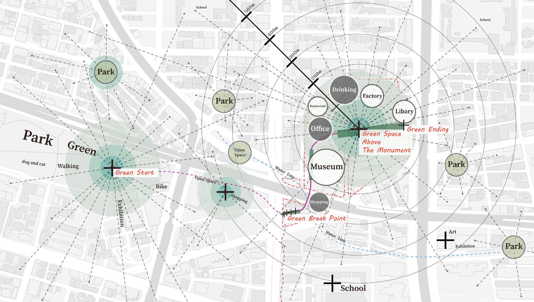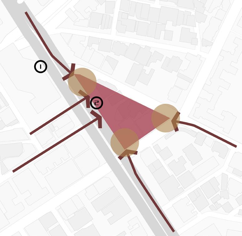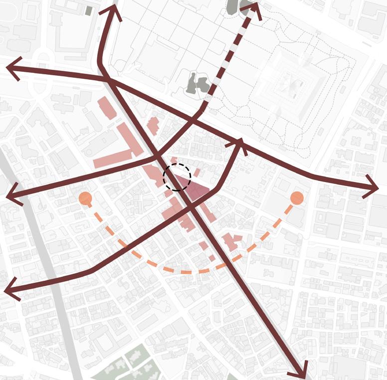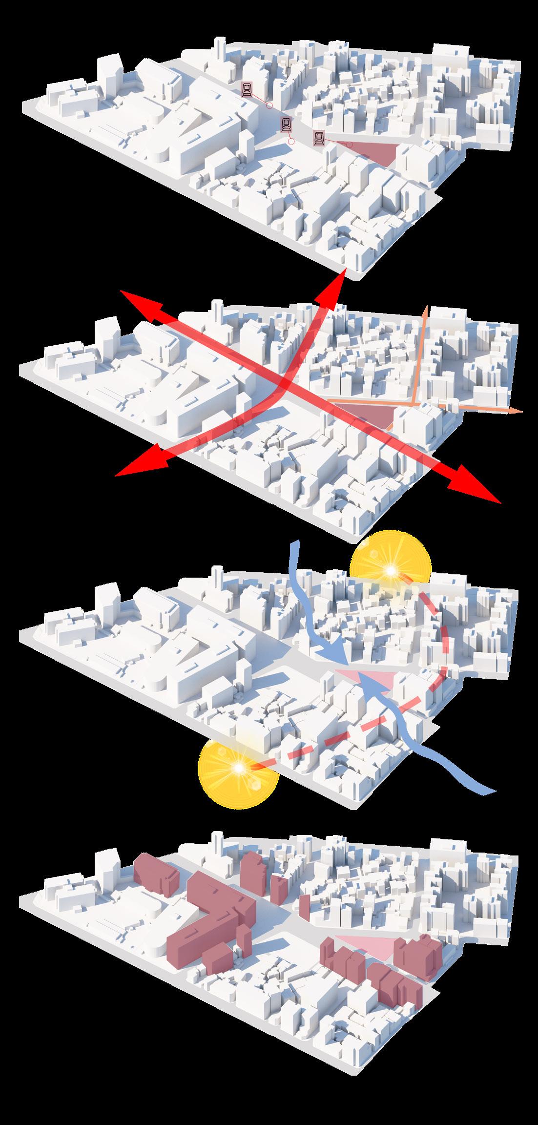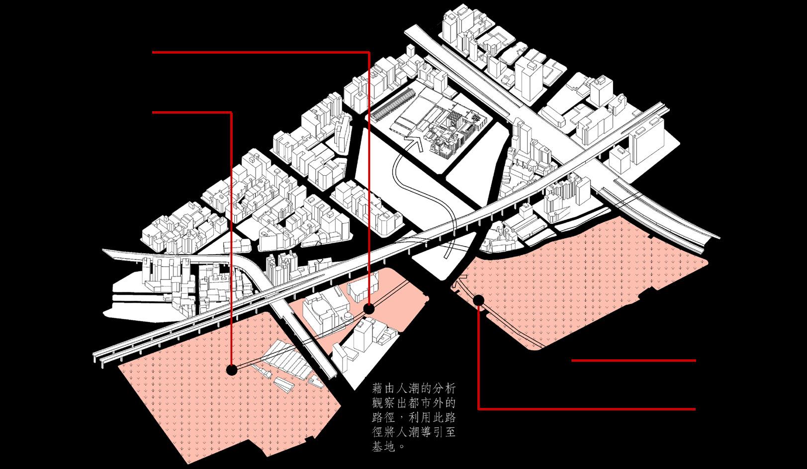 34 01 05 04 03 現代化的腳步⽇益加速,⽽捷運的出現對周邊的發 展帶來轉變,早期時代遺留下的景觀與文化,⾯臨 檢視與取捨的境地,如何萃取傳統市場價值並結合 公共設施,創造人們對於台北城的印象,現代與歷 史的結合,與市場價值。 Issue/Concept 以往台北城周遭創造許多歷史景點而基地位於台北 城的邊界,希望利用基地作為台北城景點的引入 點,讓台北城形成一個觀光生活圈,並讓在地文化 與國際接軌。 中正紀念堂站作為進入台北城文化古蹟圈,以南門 市場為入口媒介,達到聚集人潮,再擴散引導至各 個古蹟文化空間。 02 01 南門市場對向基地,位於舊台北城的邊緣 地帶,此圖標示出台北城周遭各個對於現 代重要之地標。 圖說 02 大台北重要市集地區。 03 地域性分析,交通、周遭建築高度、日照。 小區域分析,街道端點、捷運出入口。 04 05 3D建築基地分析,由上至下依序為,捷運 出入口,主要道路及次要道路,基地上日 照及風向,建築基地高度(較高之建築)。