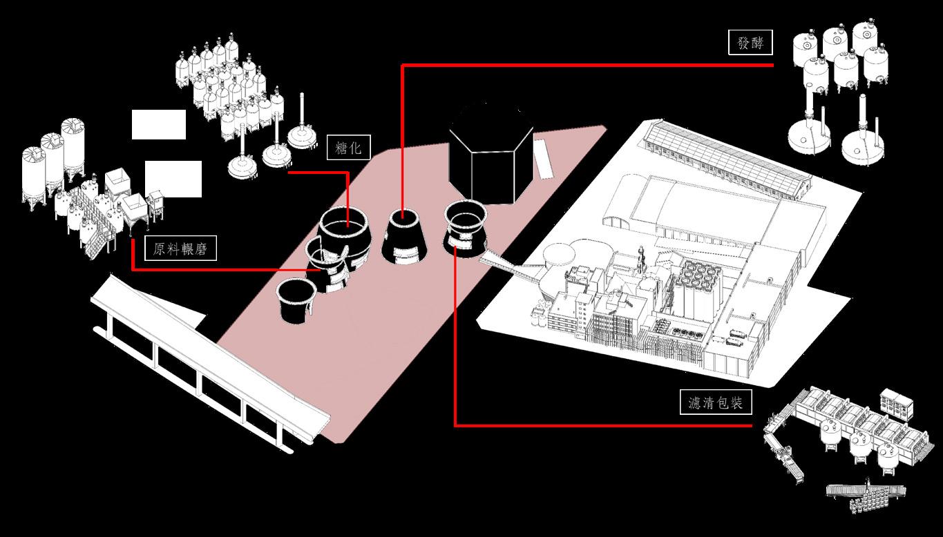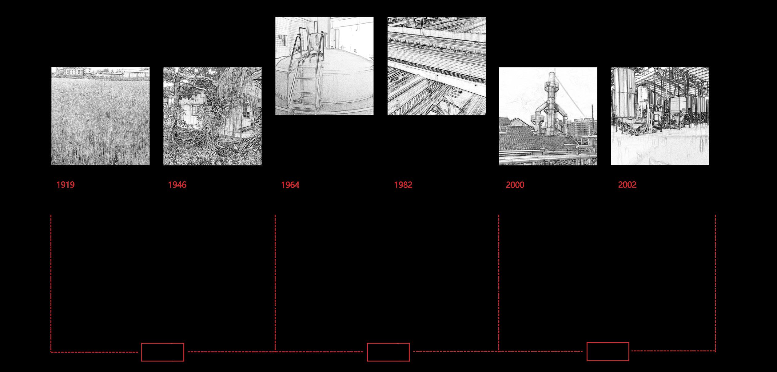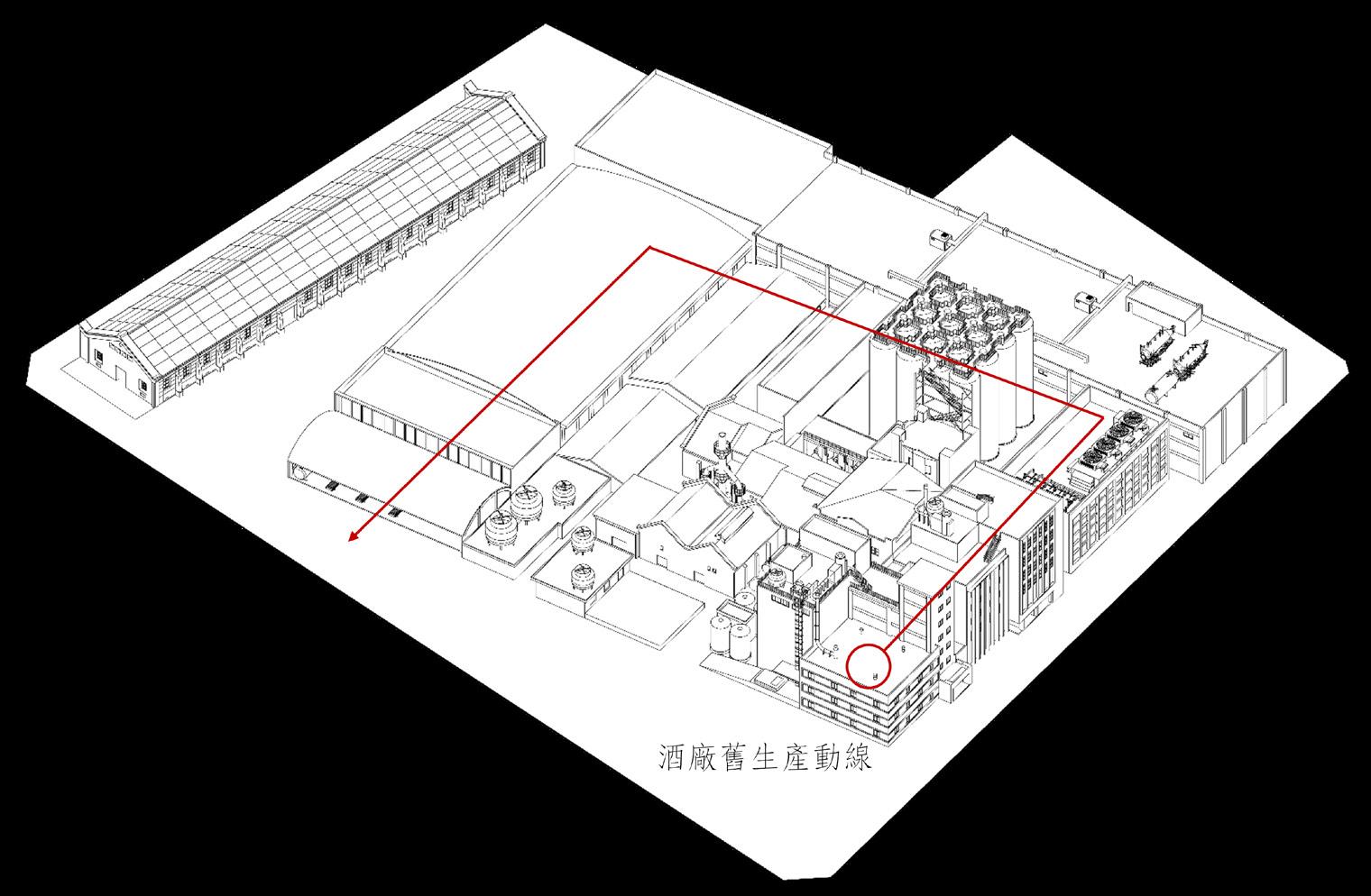 8 08 圖說 住宅區移轉 05 1糖化大樓 2釀造大樓 3儲酒大樓 4戶外發酵槽 5日式建築機具 6包裝工廠X 現精釀啤酒 05 06 07 基地分割 06 主設計範圍-新開放公共空地 07 啤酒製造過程之各項設備大樓 生產流程-1~6 08