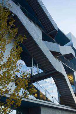 The unique shape of the building created a number of different units within. The first floor of this new development has commercial spaces, a lobby and some recreational areas, while the rest if the building has parking on the cellar, and a habitable rooftop deck.