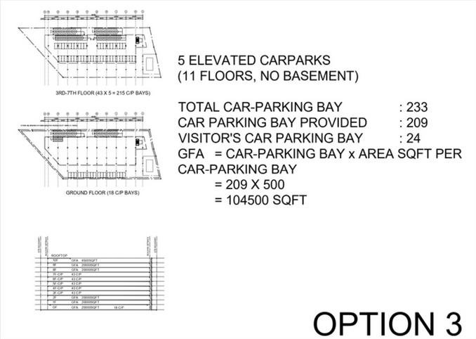 The maximum elevated carpark floor is determined by plot ratio, which is 8 maximum floors. These options are rejected by clients, as he doesn't want elevated carparks.
