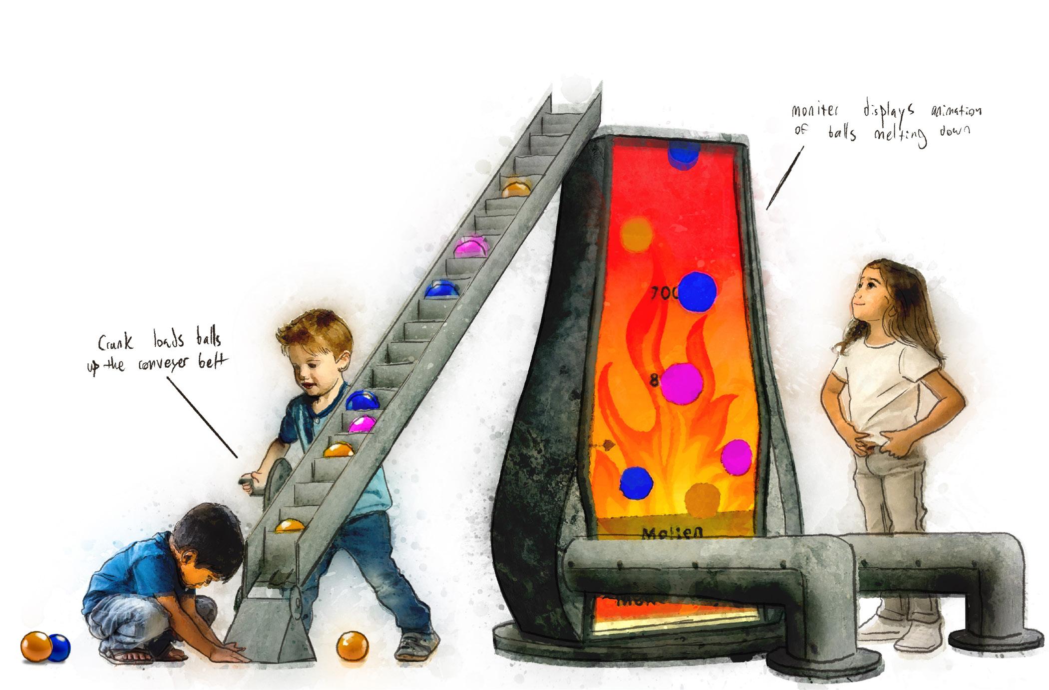 I also created several concept sketches depicted how children might playfully learn about Birmingham’s cast iron industry, illustrated by the example below.