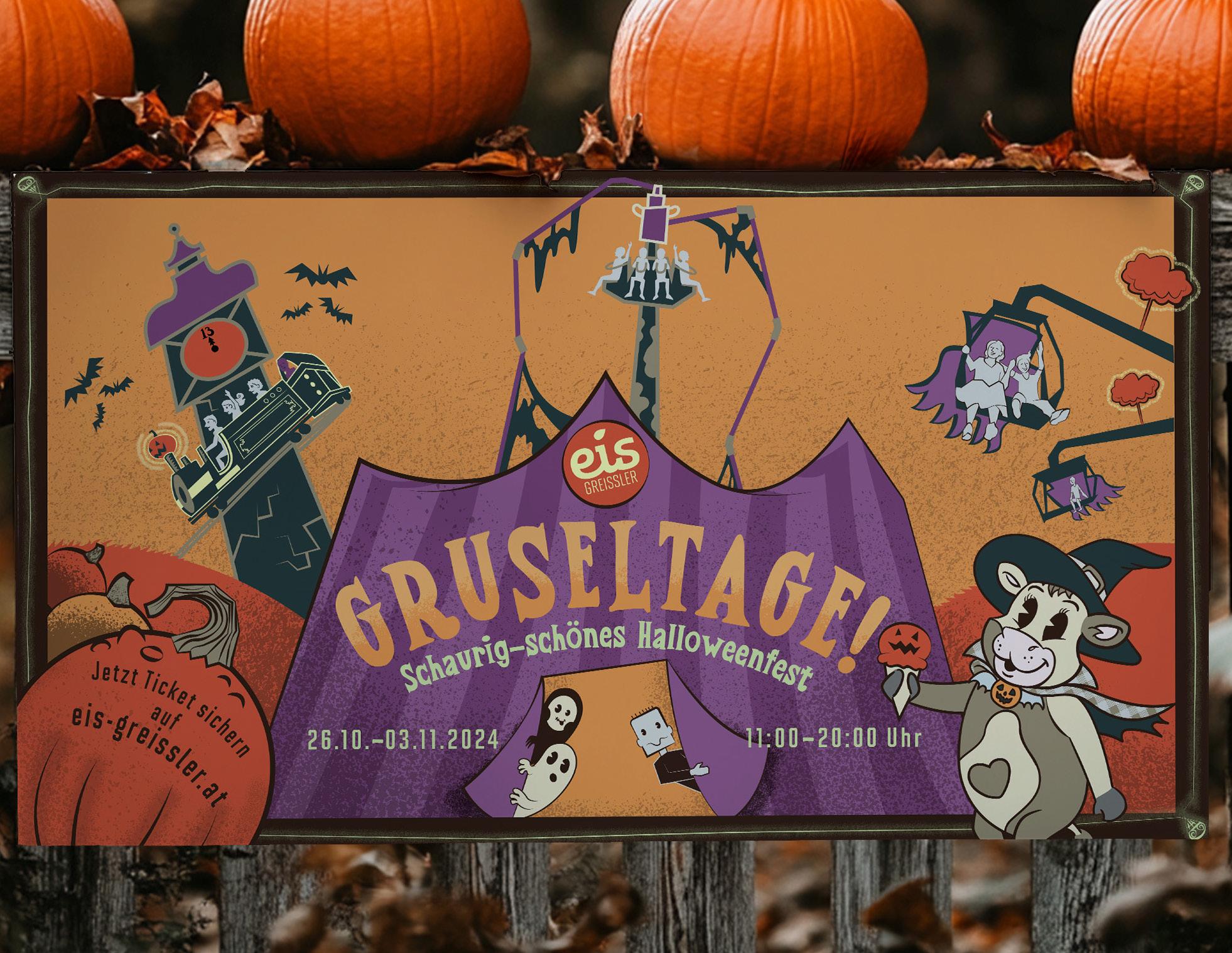 To market the Halloween festivities at Austria’s Eis-Greissler theme park, I was tasked by Alex Korting Themed Entertainment Design to create a series of 7 posters at different dimensions. Drawing from the aesthetics of retro “rubber hose” style animation as well as Halloween posters from the same period, I reimagined both the park’s attractions and their adorable cow mascot Rubi with pie-eyes, gritty textures, and a limited color palette befitting the spooky family event.