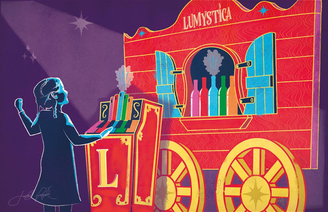 Created by Lightswitch, Lumystica is a dazzling touring event of circus-inspired fun. I created three pieces of highly-stylized concept art, reminiscent of traditional block print posters but with a fittingly modern and funky twist. The art depicts a kaleidoscopic hall of mirrors; a room of circled circus wagons and shimmering astral lanterns; and an interactive game featuring an old-time circus organ!