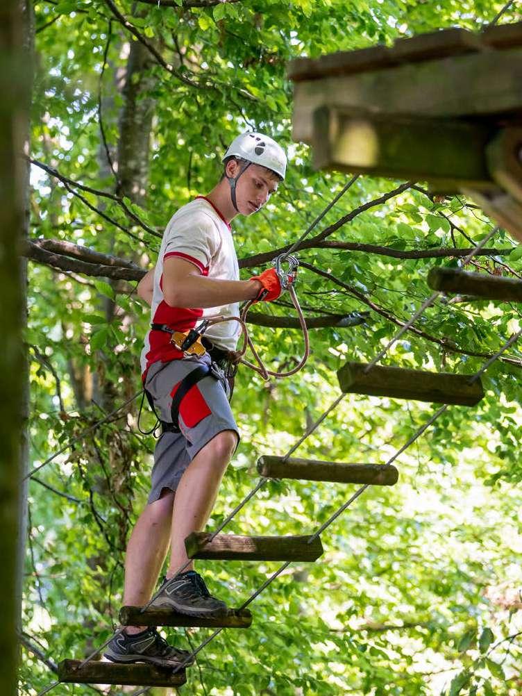 Am letzten Tag des Basic Camps stand auch in der 10. Durchführung der Besuch im Seilpark auf dem Programm. Nach einer Einführung ging es endlich los. Während einigen die Knie zitterten, als sie auf dem Weg zum Start die hoch gespannten Seile sahen, machten die anderen schon Pläne, auf welche der schwierigeren Strecken sie zuerst wollten. Die eigene Sicherheit und die der andern stand immer im Fokus.