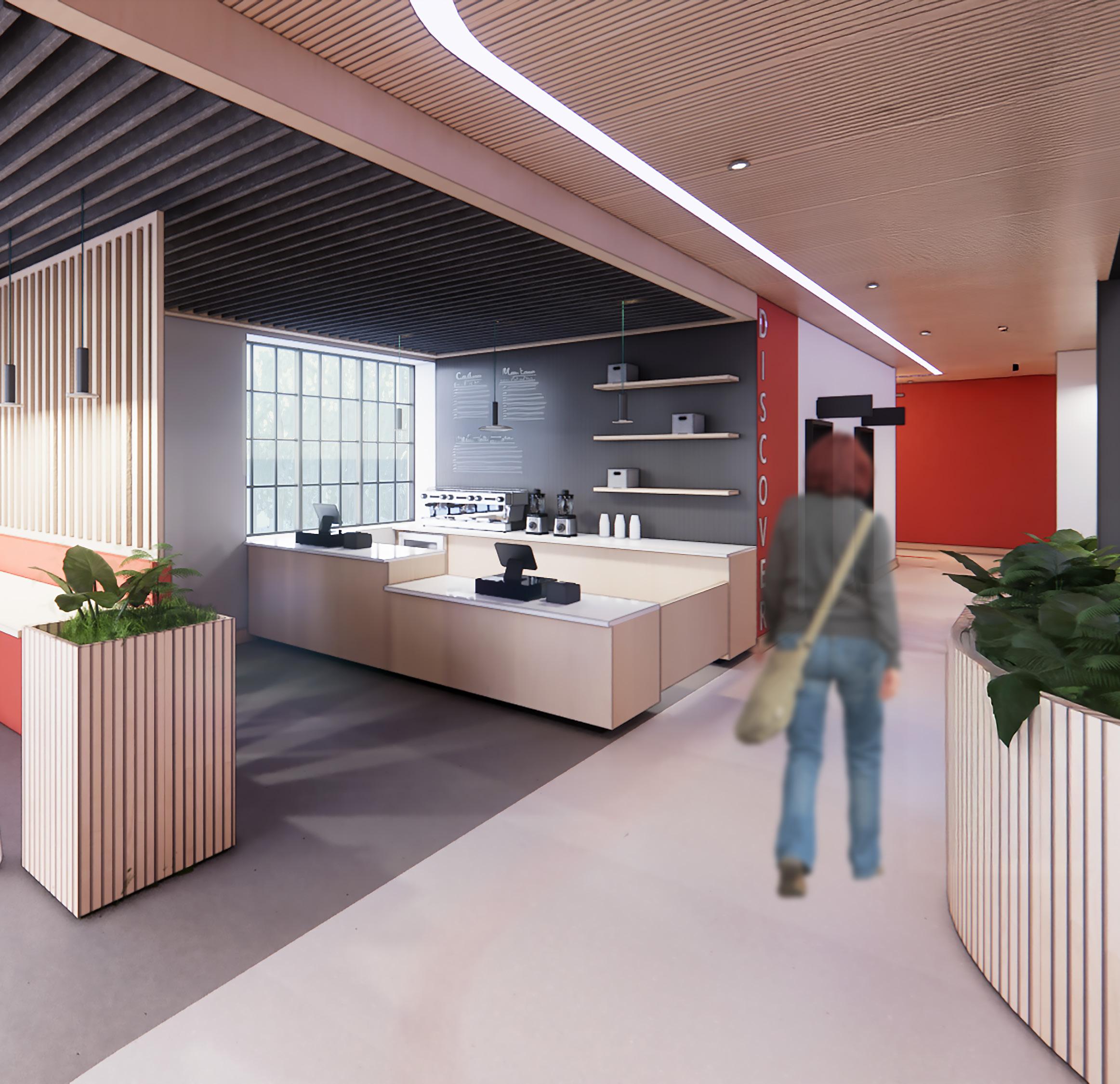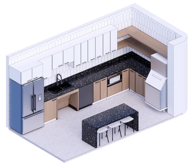 The university café provides students with a welcoming environment to study, dine, and collaborate with peers. Acoustically, the space is enhanced with felt baffles suspended above the seating area to reduce ambient noise and create a calm, comfortable atmosphere for both students and staff. The service counter includes an accessible section designed at ADA-compliant height to ensure equitable use for all visitors. Additionally, the café menu is presented on a chalkboard wall, introducing a creative and dynamic visual element that reinforces the café’s inviting character.