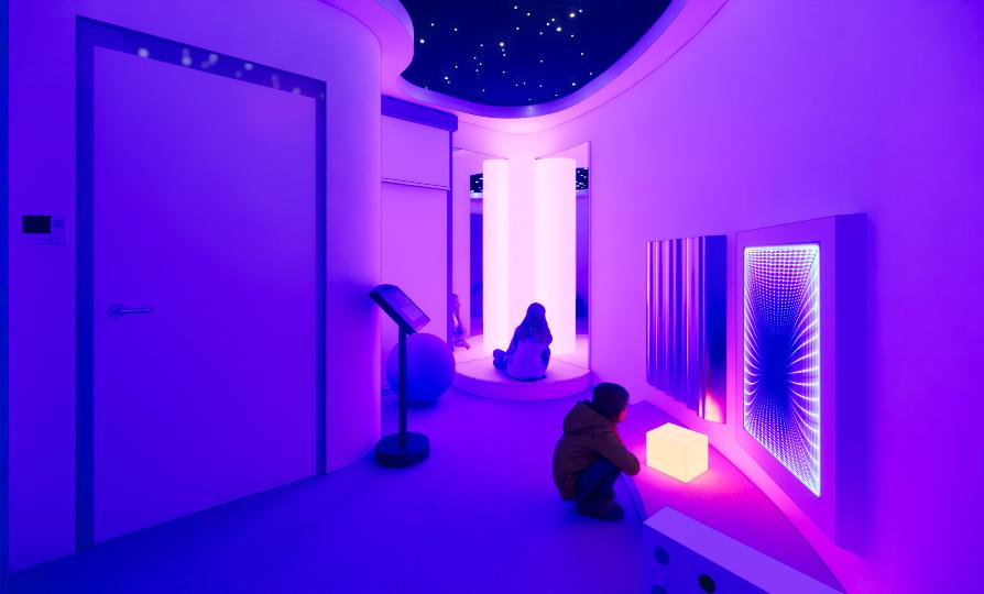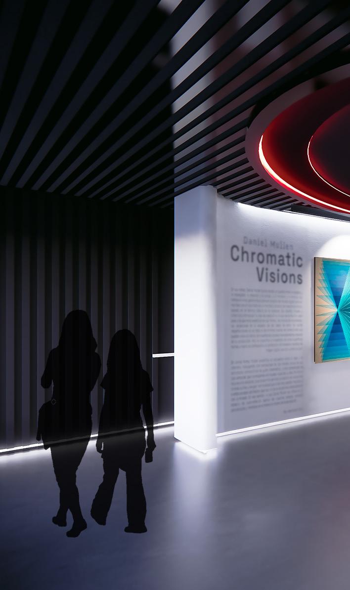 The gallery is organized around the sequential phases of an eclipse, using shifting light conditions to define a series of spatial zones. As people move through the first floor, they pass through three transitional environments, each calibrated to progressively darker light levels. This gradient guides guests from bright, open areas into spaces of deepening shadow, reinforcing the eclipse metaphor while choreographing a sensory journey that heightens perception, anticipation, and emotional engagement.
