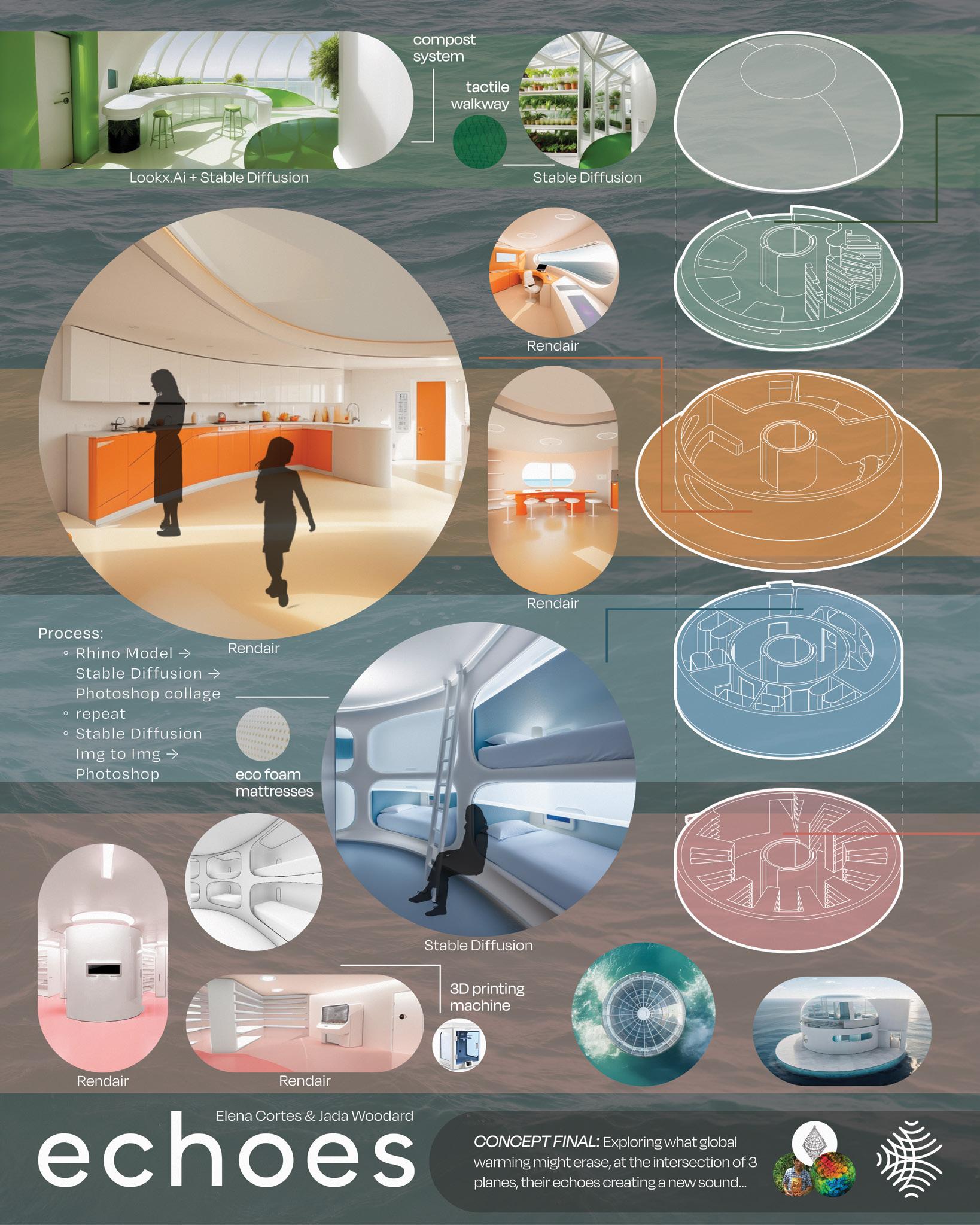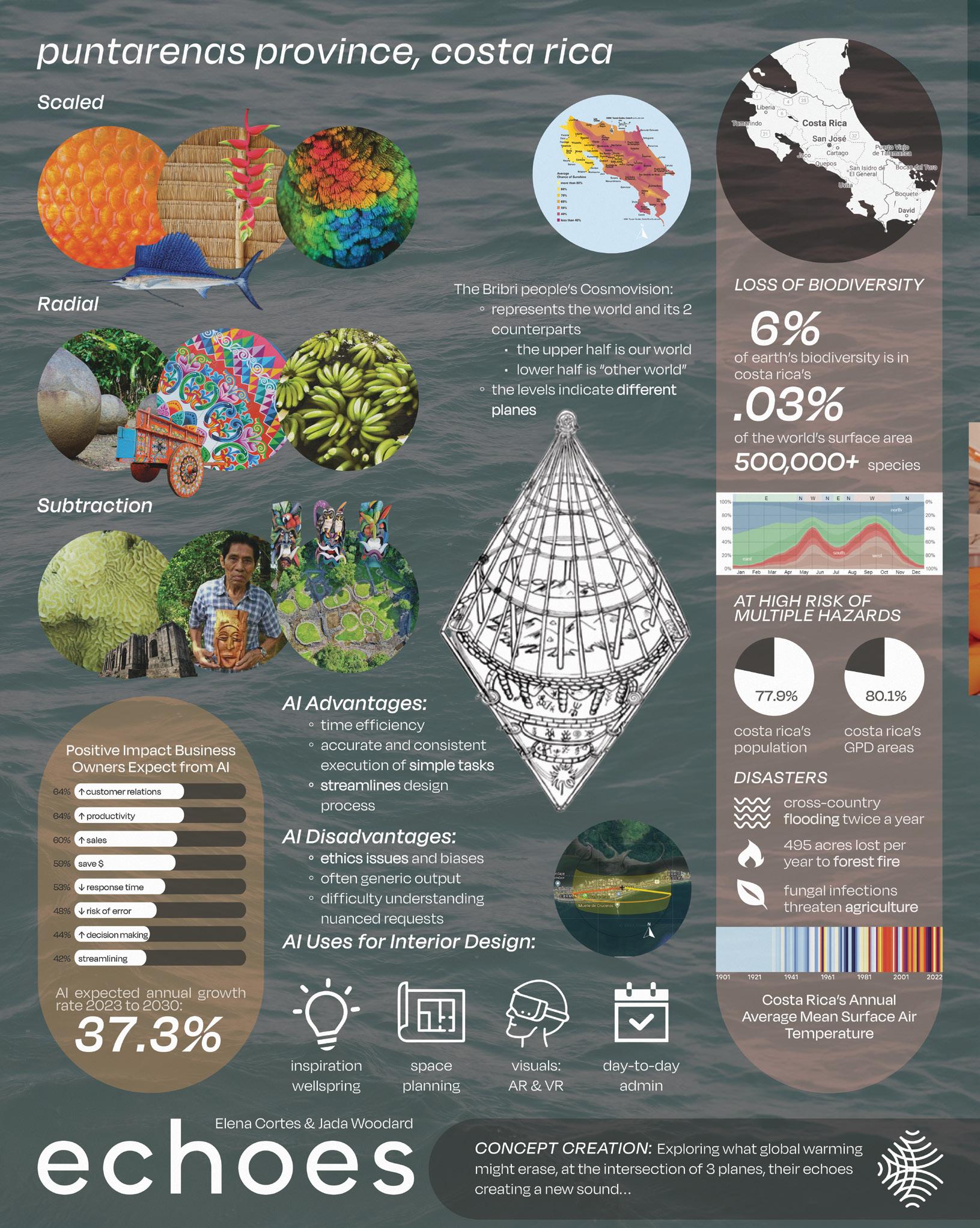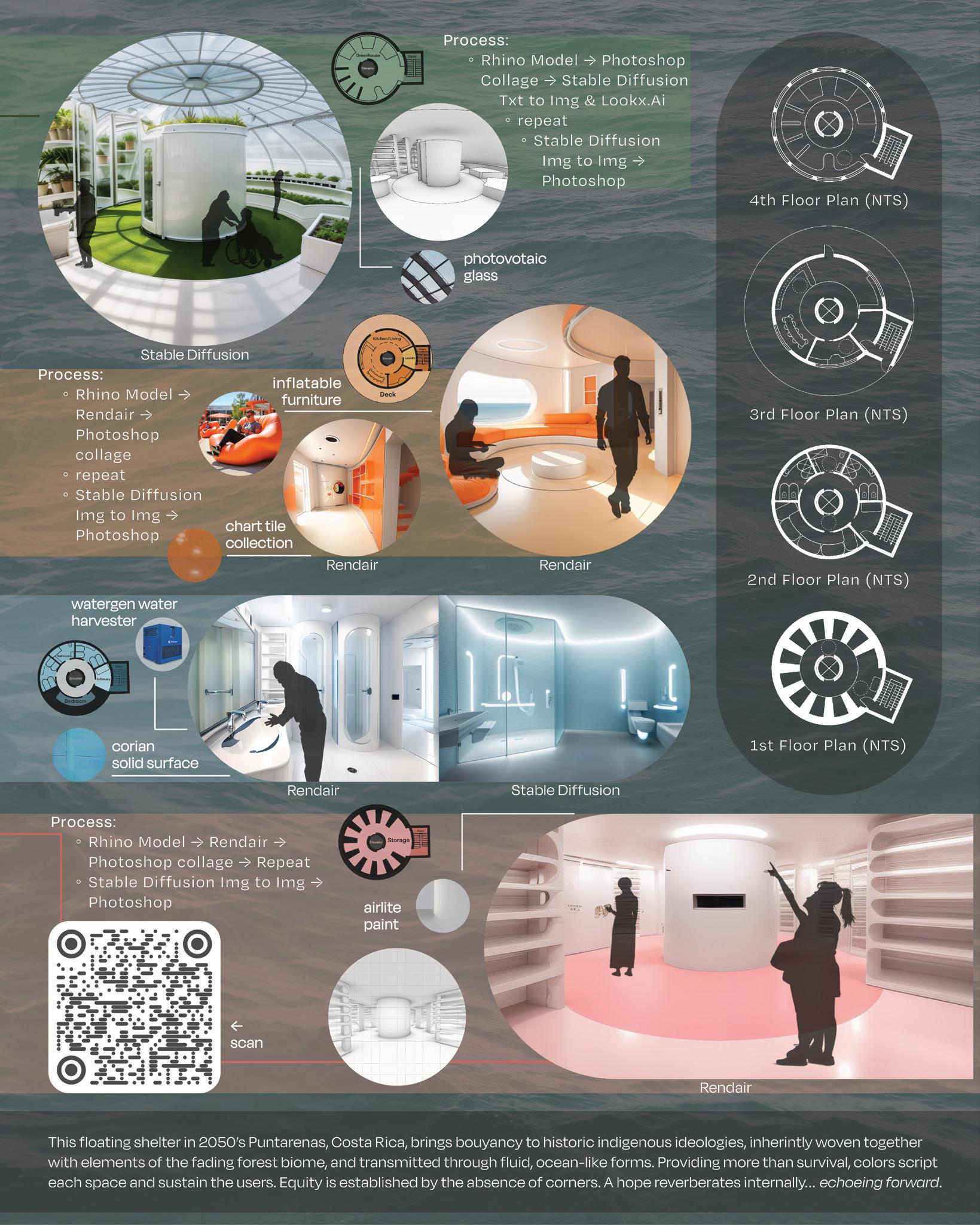 Echoes is a floating survival shelter located off the coast of Puntarenas, Costa Rica. The structure draws inspiration from the traditional cosmo house of the Bribri people, an indigenous group known for their deep connection with nature and the cosmos. This shelter is a modern interpretation of this cosmic dome, providing a place of refuge that aligns with the Bribri’s tranquil beliefs and relationship with the environment. It is a space that increases survival in adverse conditions but also promotes a way of life that is in tune with the natural world, echoing the Bribri’s culture for the earth and the cosmos.
