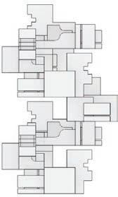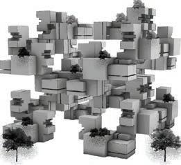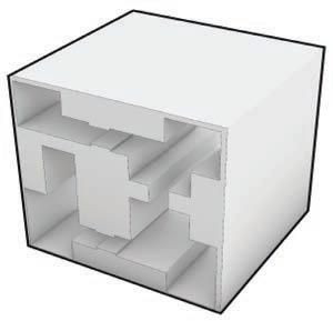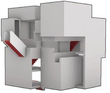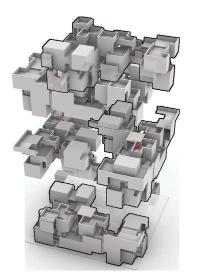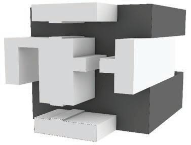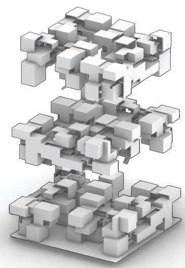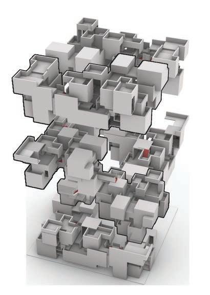 Two unit typologies are developed through alternate mirroring, stacking, and rotation, producing varied spatial experiences and circulation patterns. Staggered volumes create contrasts between enclosed and open spaces, fostering diverse dwelling conditions.
