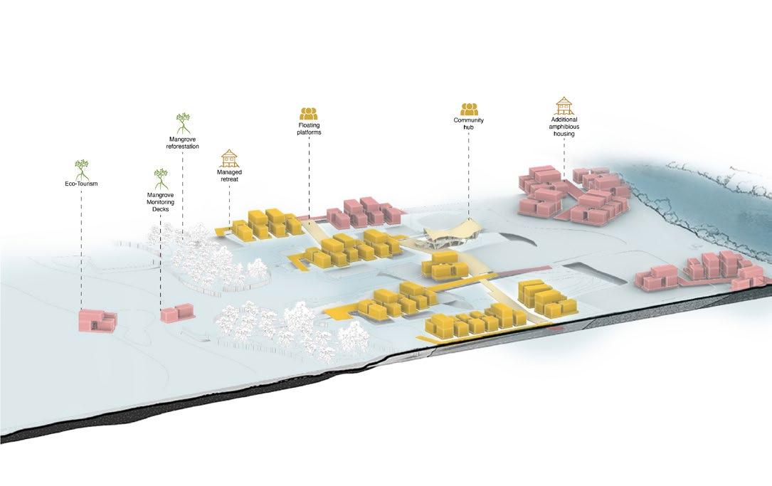Existing conditions within our pilot site show people living precariously on the water’s edge, encroaching on the Ciénaga, and affecting the health of mangroves. Families claim space through an informal rule of law, rendering the edge of the ciénaga inaccessible. In the short term, we include public elevated platforms, care for mangroves, water filtration, a small community hub, and a model amphibious house to establish trust with the community and show what is possible. Floating houses are a desire of local community partners we interacted with. Sleeping pods for non-extractive tourism co-exist with an increase in amphibious housing, recognizing the need for a return to food production in farming and fishing according to seasons of rain and tide, akin to the ancestral practices of the Zenú indigenous peoples of the region.