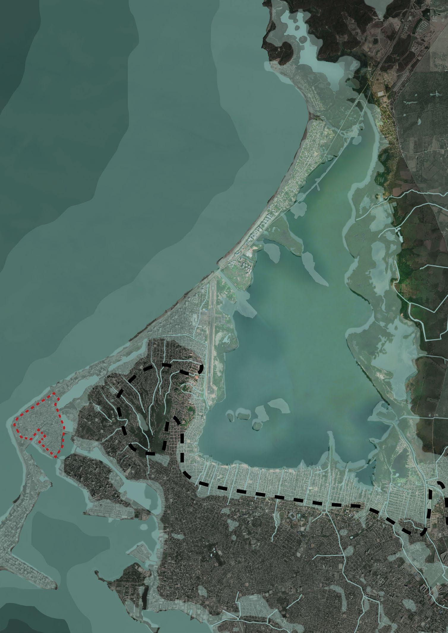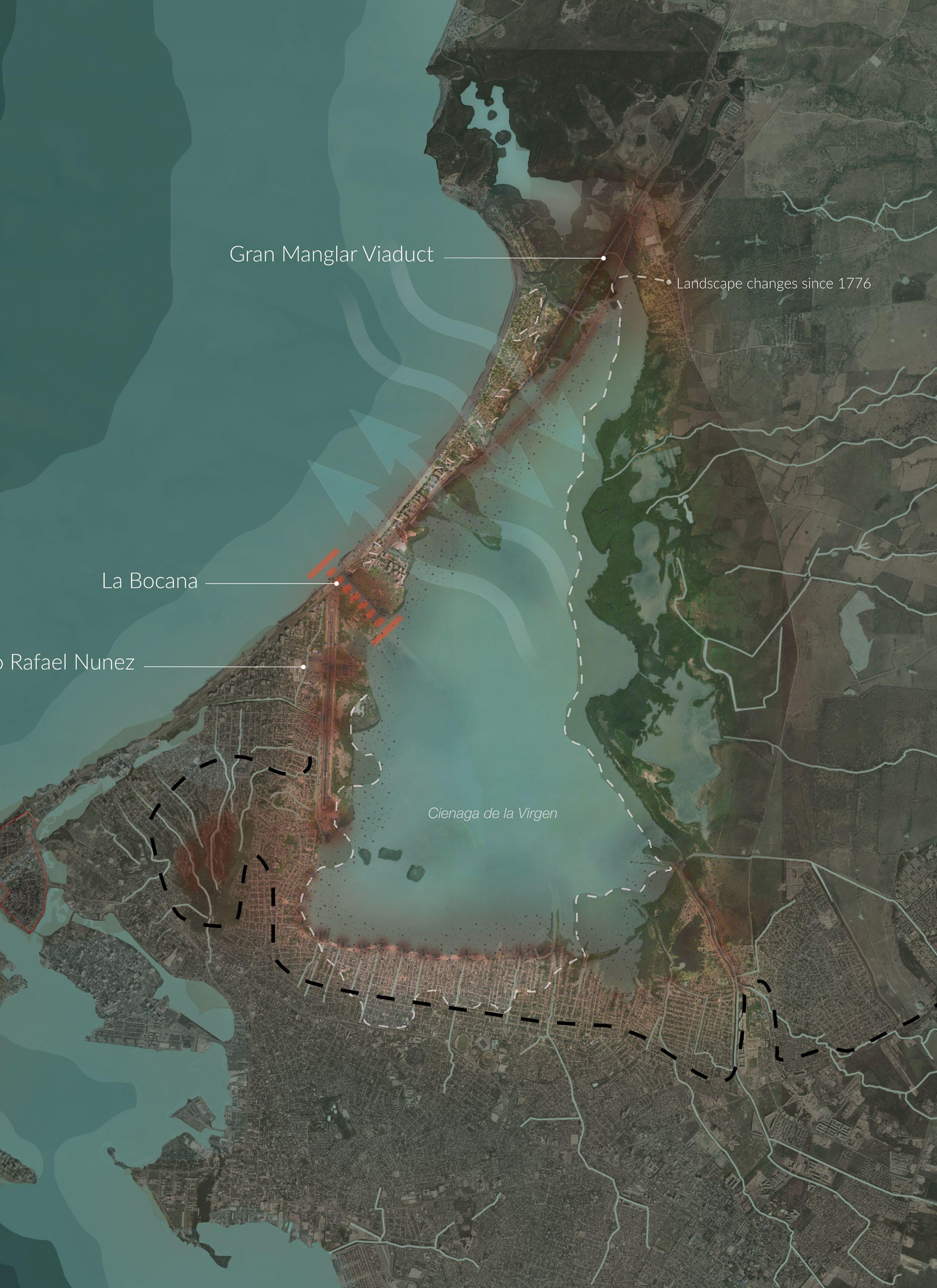 The Cienaga de la Virgen has gone through major landscape changes over time, from its open and freeflowing bay which allowed a flushing and exchange of sweet and salty waters, into its now deteriorating and choked bay with a biodiversity and local community that is steadily decreasing in health. The factors that continue to push this decrease includes heavy infrastructure like the airport, the Dutch project La Bocana, and the Gran Manglar Viaduct, which have all caused the cienaga to choke over time. The extractive tourism within the walled city of Cartagena also heightens the collapse of what we call the “unwalled city”. Not only affecting Cartagena through its economy, but also through the increased pollution, which ends up populating canals and self-built communities of displaced locals and migrants along the Cienaga, who also face the most risk with projected 2040 sea level rise. Communities are now being destroyed and displaced again as the government hardens the edges of the cienaga with the via perimetral, to stop encroachment and invite tourism. As a result, mangroves are being destroyed, along with our relationship with nature, and the natural benefits they provide.