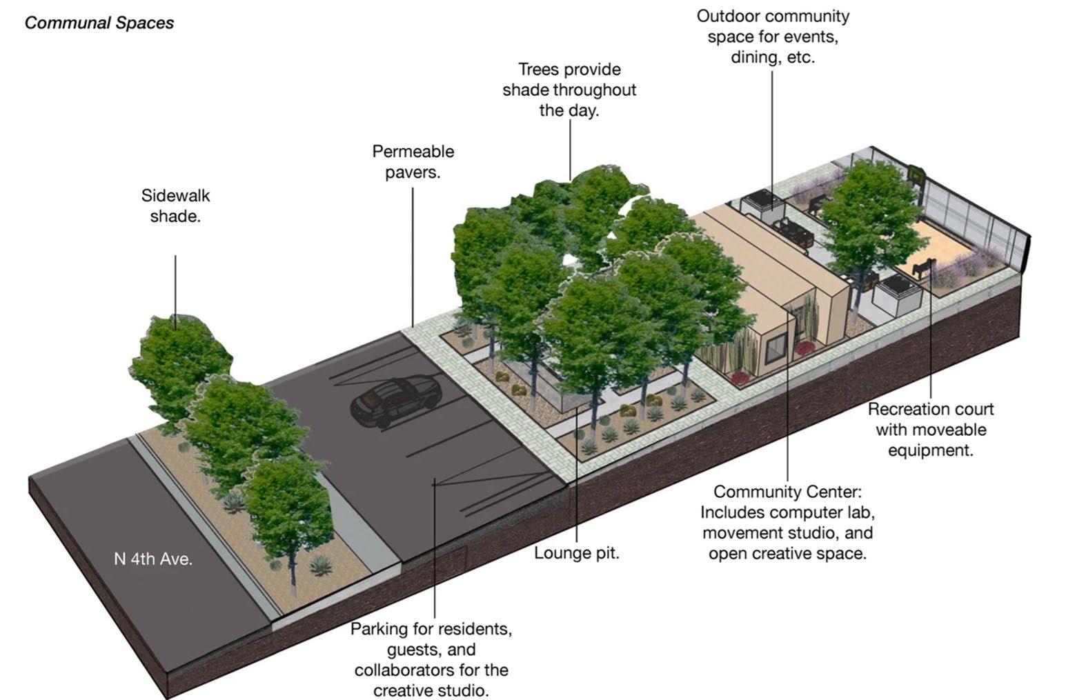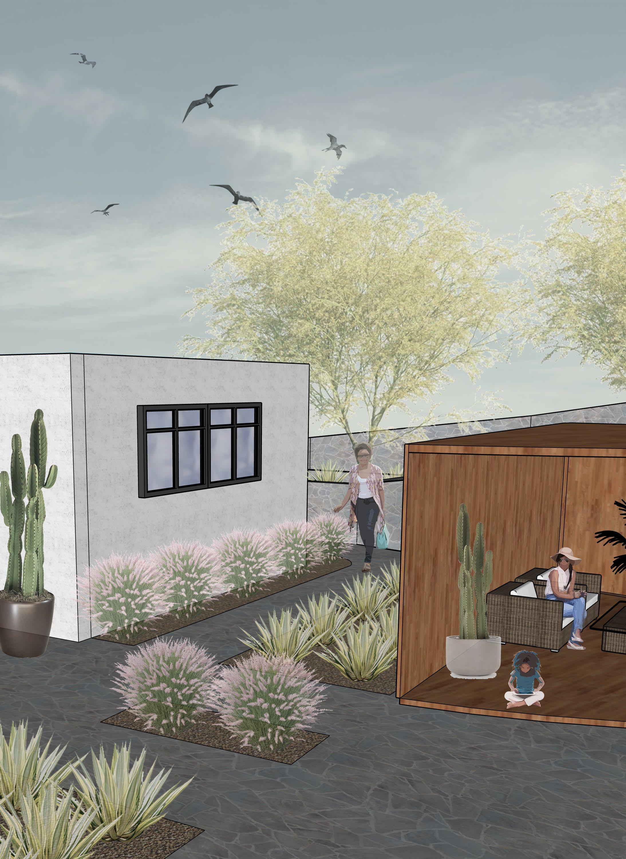 The housing crisis in Arizona is dire, and has only gotten worse over the last few years. This project is an exploration of the “missing middle housing densities” that are attainable, have less dense square footage, and rely on rich community and outdoor spaces. Urban designers connect people and places, movement and urban form, and nature to the built environment. A community like this is needed for emerging urban designers and designers alike when entering the field because it provides an opportunity to live attainably in proximity to offices and around like-minded individuals. I reached out to twelve emerging designers with a survey to collect information regarding their preferences, interests, and financial situations. From that information, I began conceptualizing and designing.