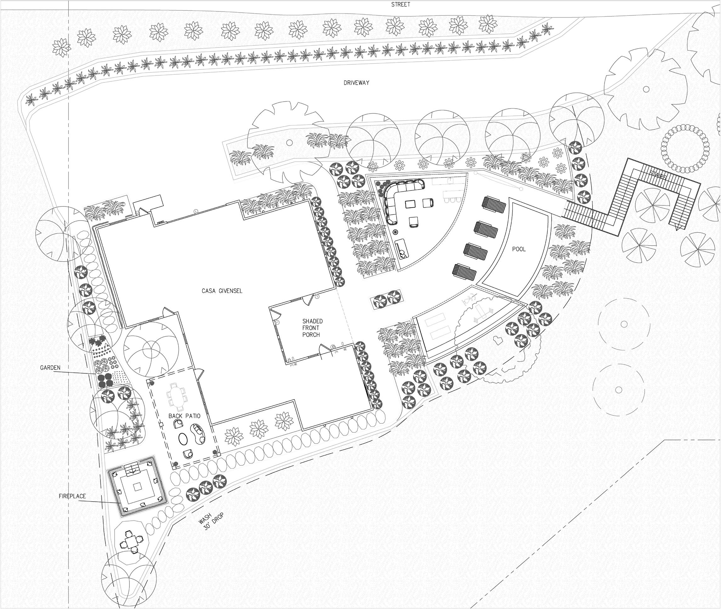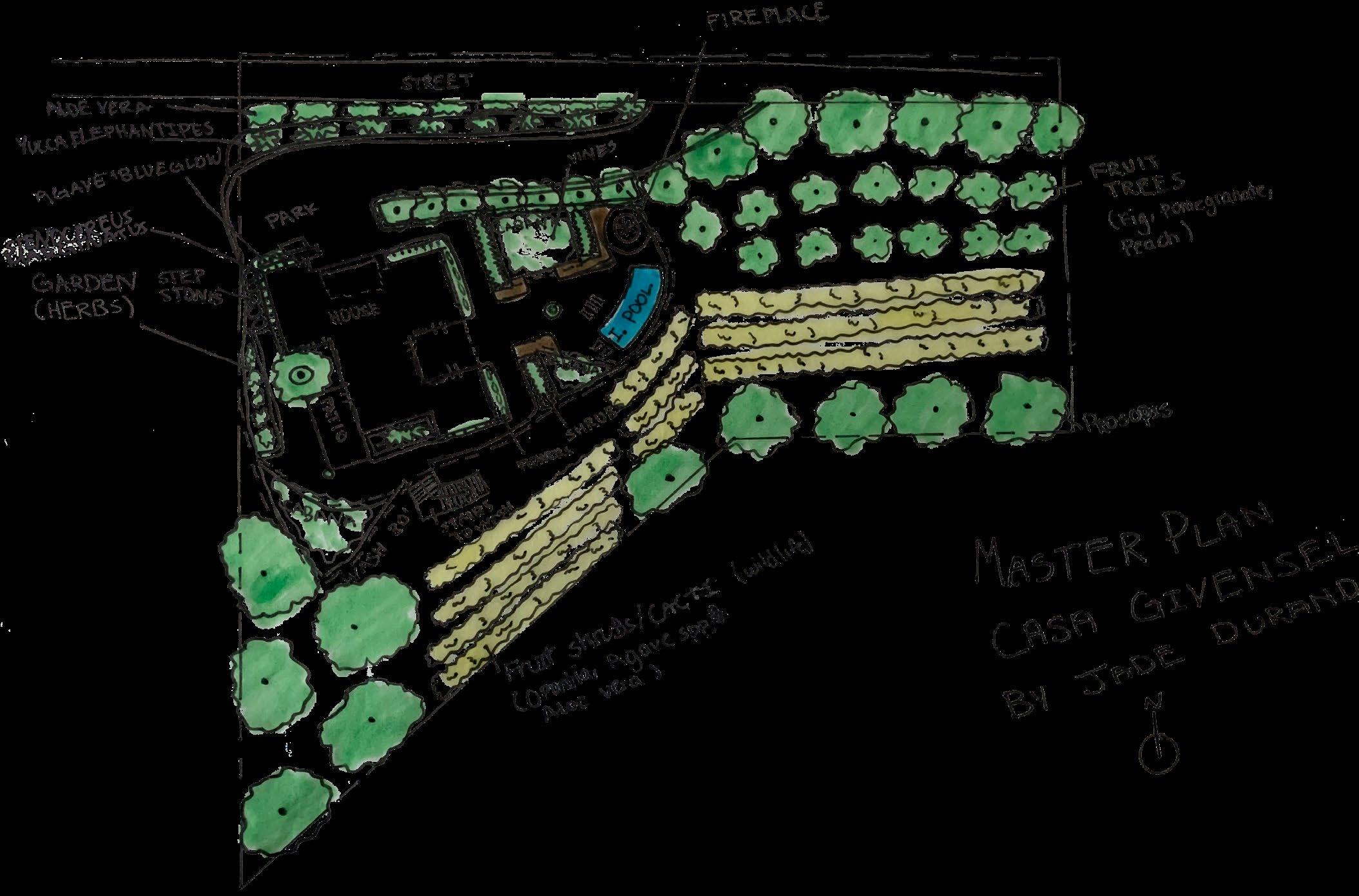 In order to practice designing for clients, groups of two students designed a site for each other. During an interview with my client, Kaya, she informed me that it was important to have a series of secluded spaces around her home. When she was a child, she would climb into a big tree in her yard and go up to the top where no one could see her and she was left alone with nature, that is what she enjoys the most. Her aesthetic is earthy tones and pastels. Client requested a social space near a pool, a hammock, a mini herbal garden, potted plants, and tall cacti. After the interview, I asked the client to provide me with a “mood board” with inspiration images of how she envisions her perfect space. With these guidelines, I began conceptualizing and designing the space. The site is located