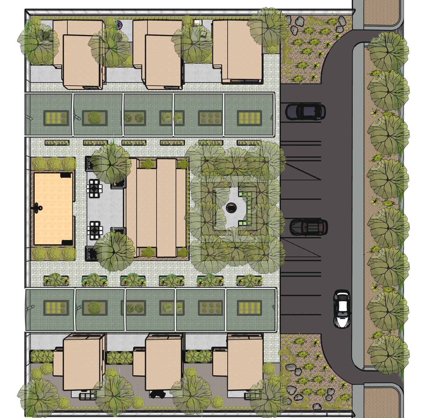 shade Permeable pavers Dense shade Outdoor community spaces Community center for design and creative spaces Resident and guest parking N 4th Ave