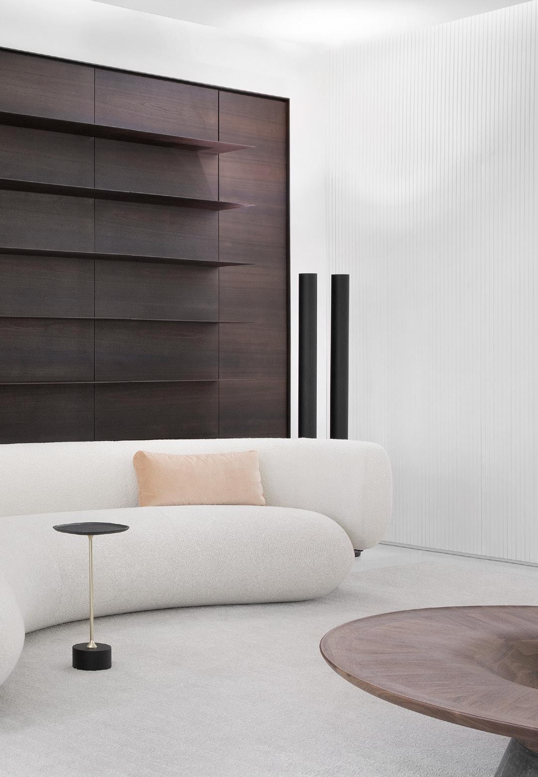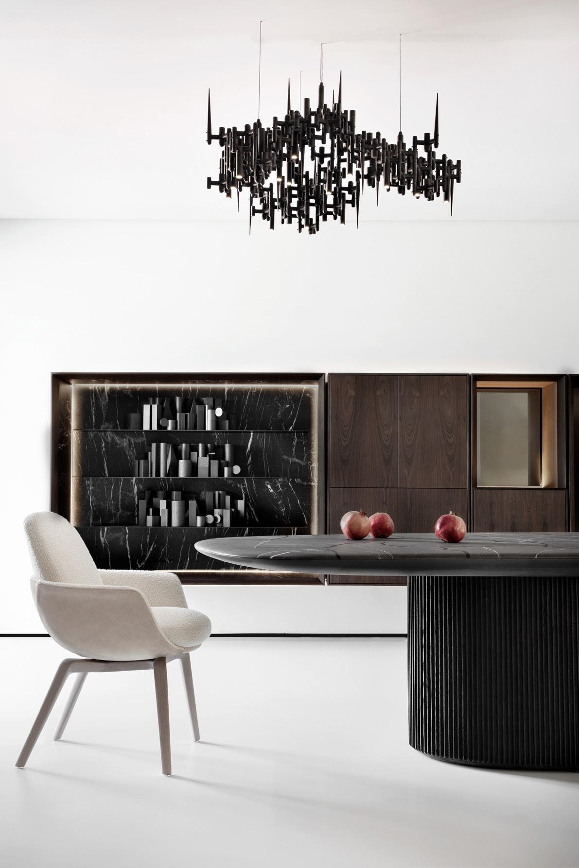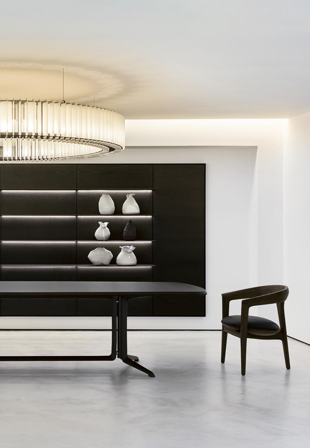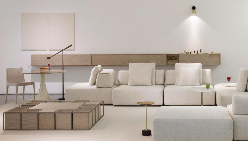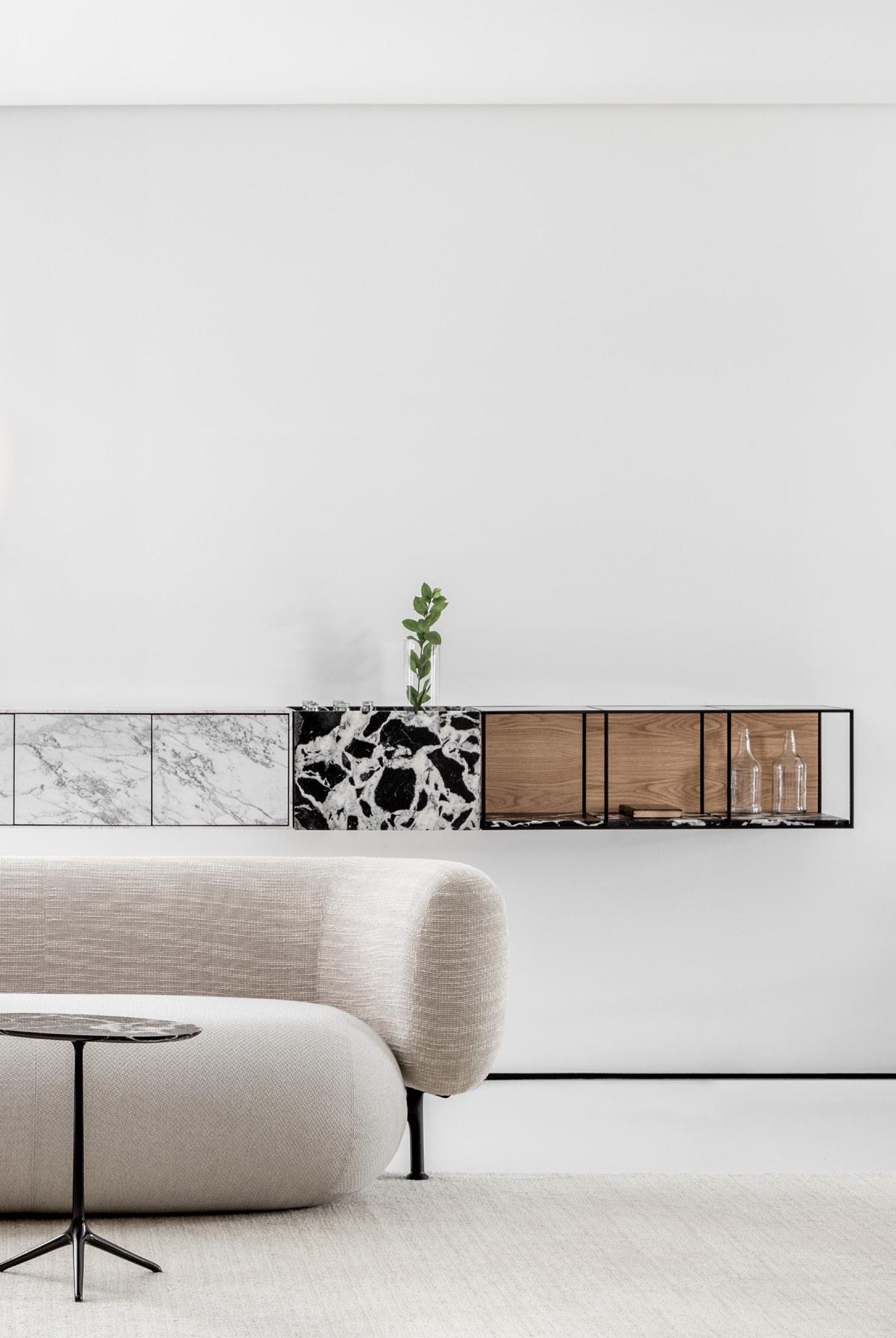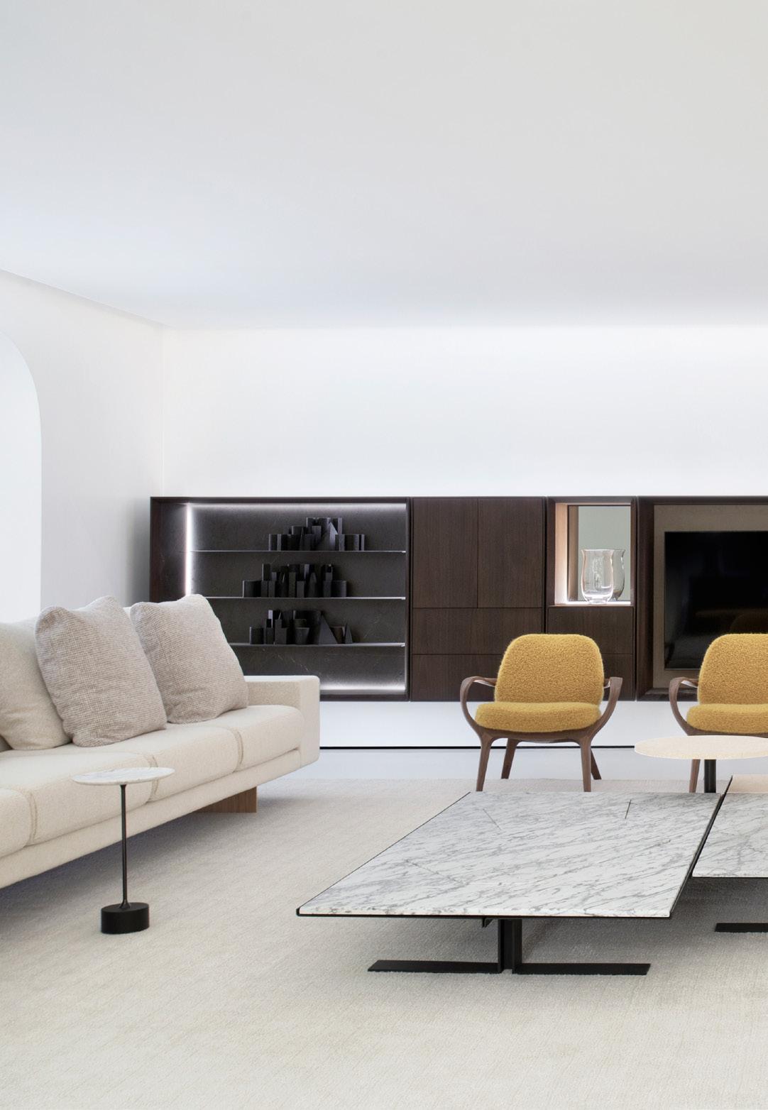 As a defining characteristic of the line, the ends are closed and support the tabletop surface across a span that can reach up to 5 meters. The system includes doors, shelves, and niches, and the sofa accommodates generous and comfortable cushions.
