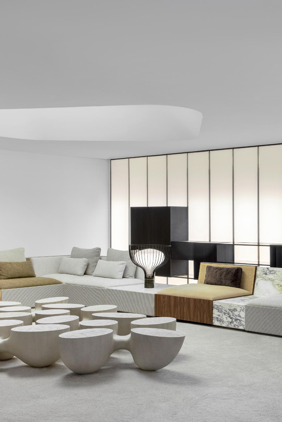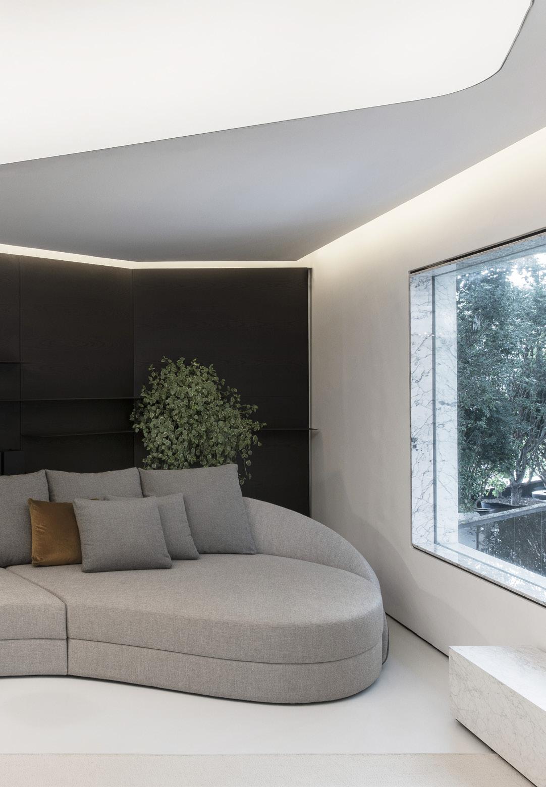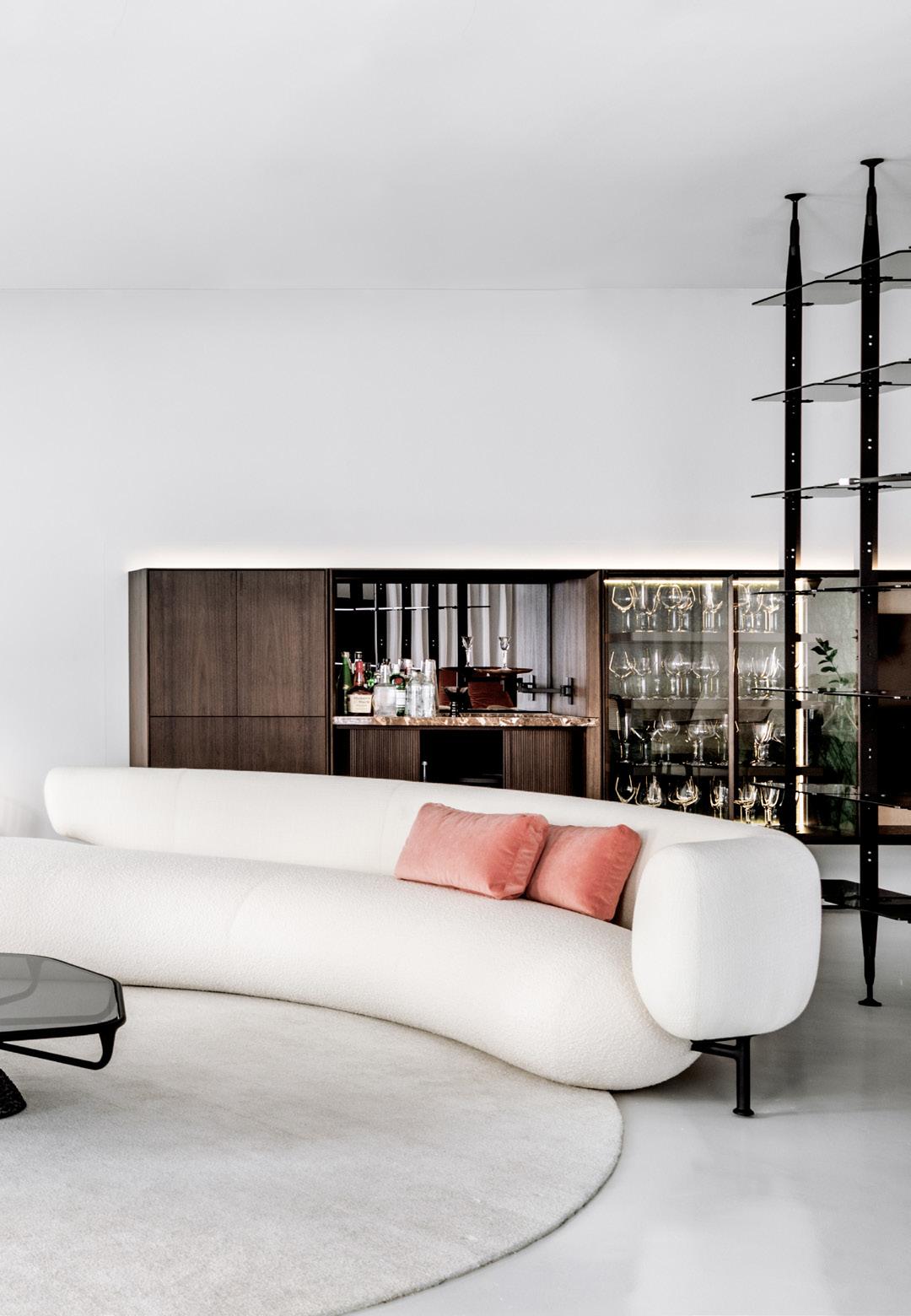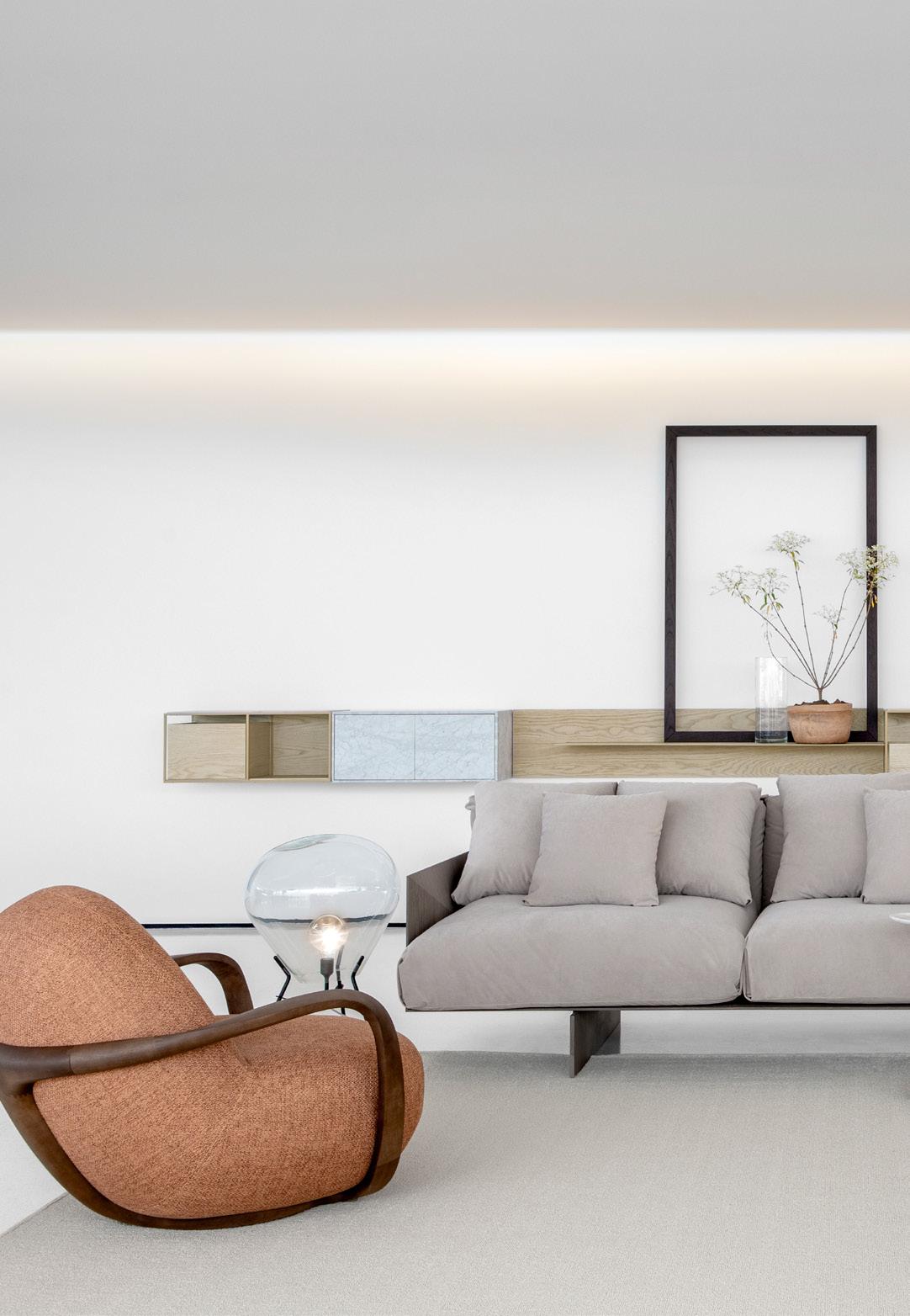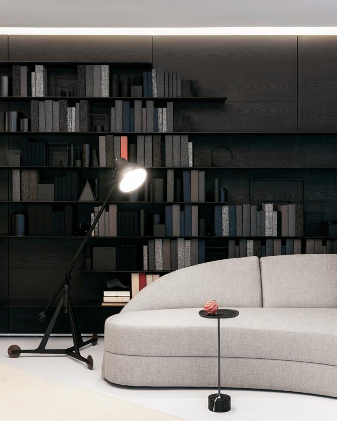 As a defining characteristic of the line, the ends are closed and support the tabletop surface across a span that can reach up to 5 meters. The system includes doors, shelves, and niches, and the sofa accommodates generous and comfortable cushions.