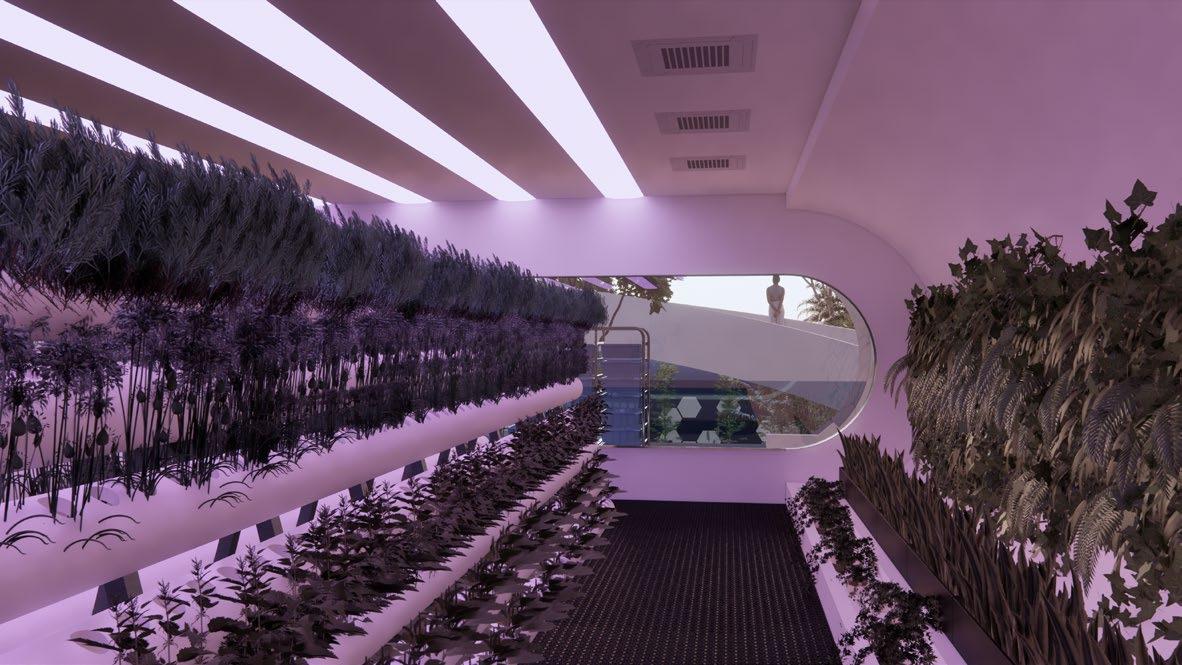 The atrium module was our chance to dream big. With levels of growing, dining, recreation and a rooftop garden on Mars- this space was meant to bring this community together. The high ceiling provides a compression and release experience for the residents, a much needed feeling as 100% of the time outside of the atrium the residents are in shorter, tighter spaces. We developed our own hydroponics and aquaponics food systems, to mitigate the radiation the residents would be exposed to by growing in the Martian soil, regolith.