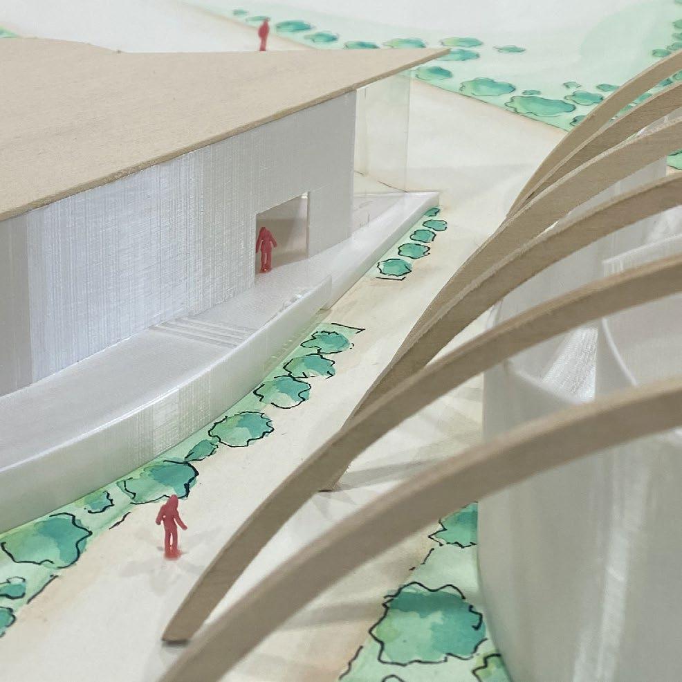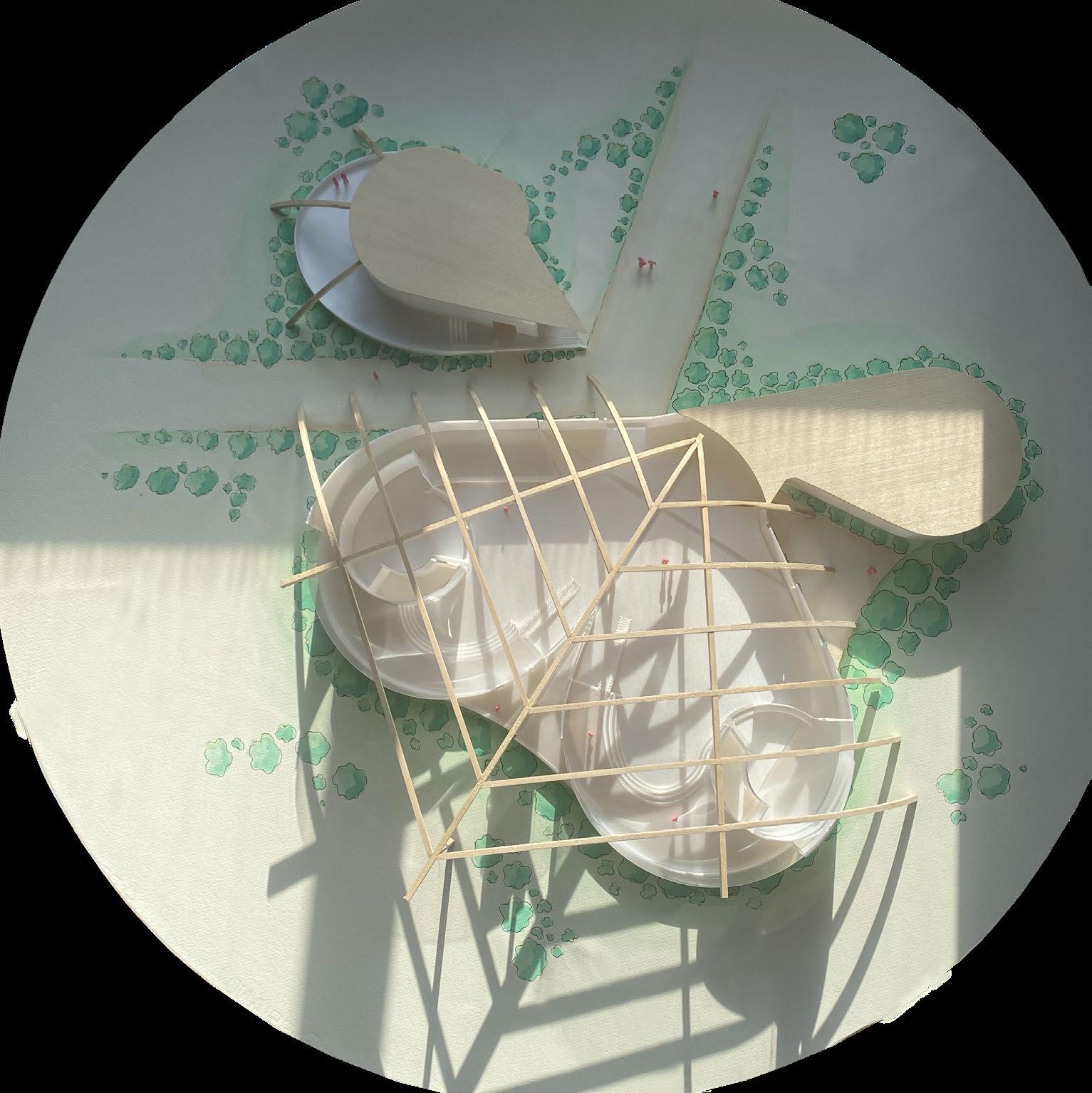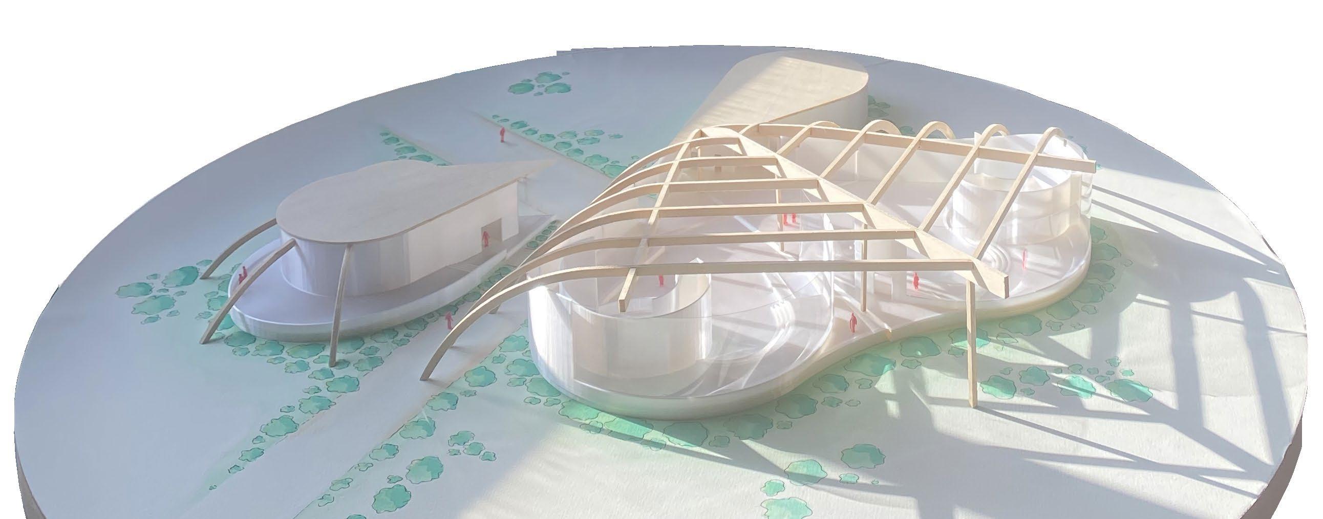 When working through what form the library might take, I used watercolors to envision my renderings. The water often blended and flowed, allowing the library to take it’s round and fluid form. I discovered in this process, when I pulled apart each space of program, wedged spaces appeared between, which eventually became the outdoor reading spaces in the project. When making the model, I brought the watercolors back to paint the site.