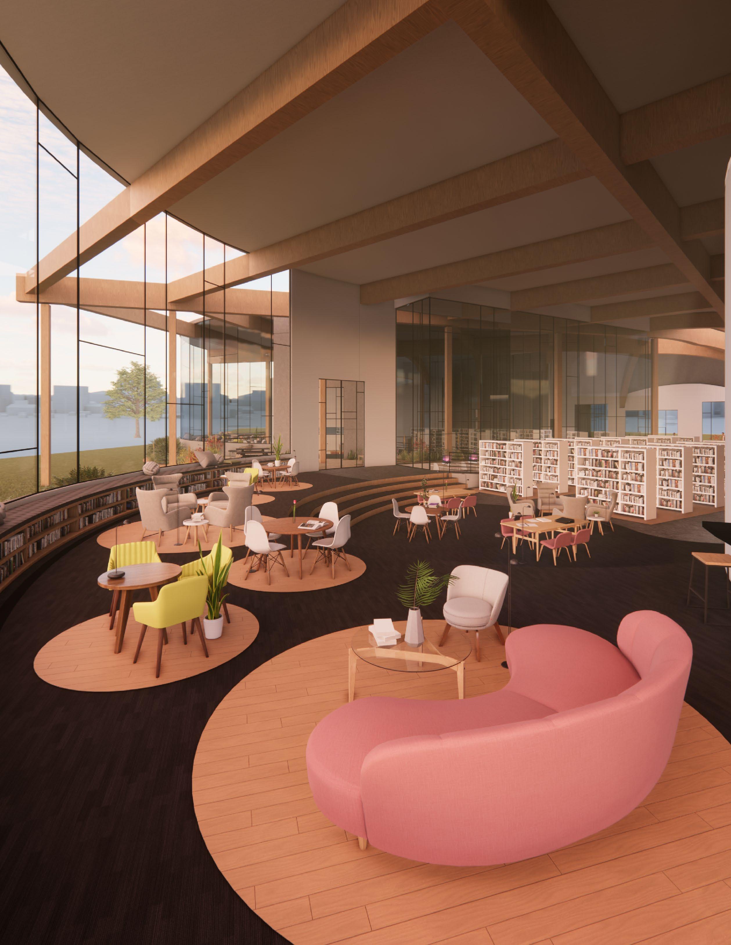 Exposed glulam beams soften the interior, while built in seating along the large, waterfront windows encouraging the visitors to relax and get lost in whatever book they are reading.