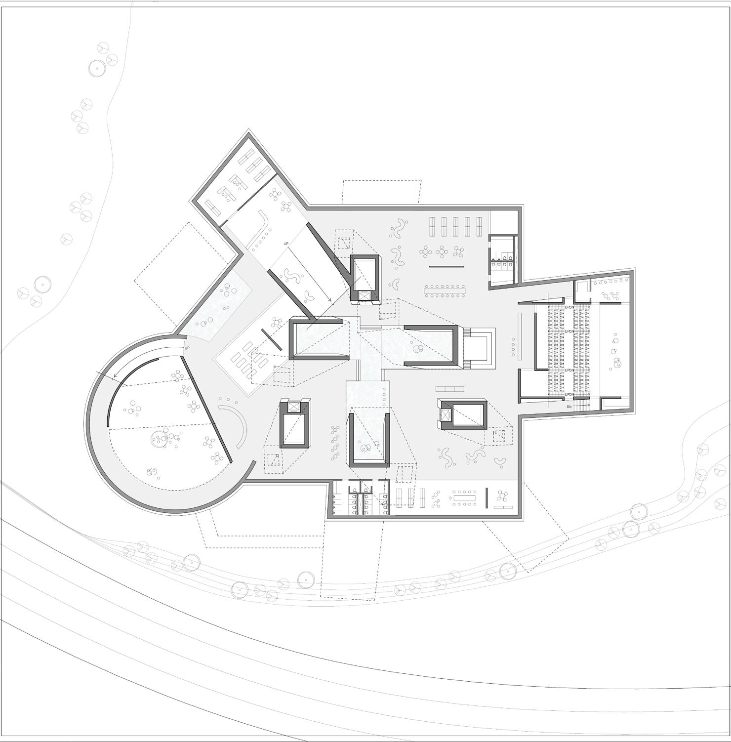 1.Main Enterance 2.Swimming Pool 3.Underground Ramp 4.Lighting Hall 5.Exhibition Hall 6.Light Column Connection Hall 7.Underground Agora 8.Theater 9.Small Theather