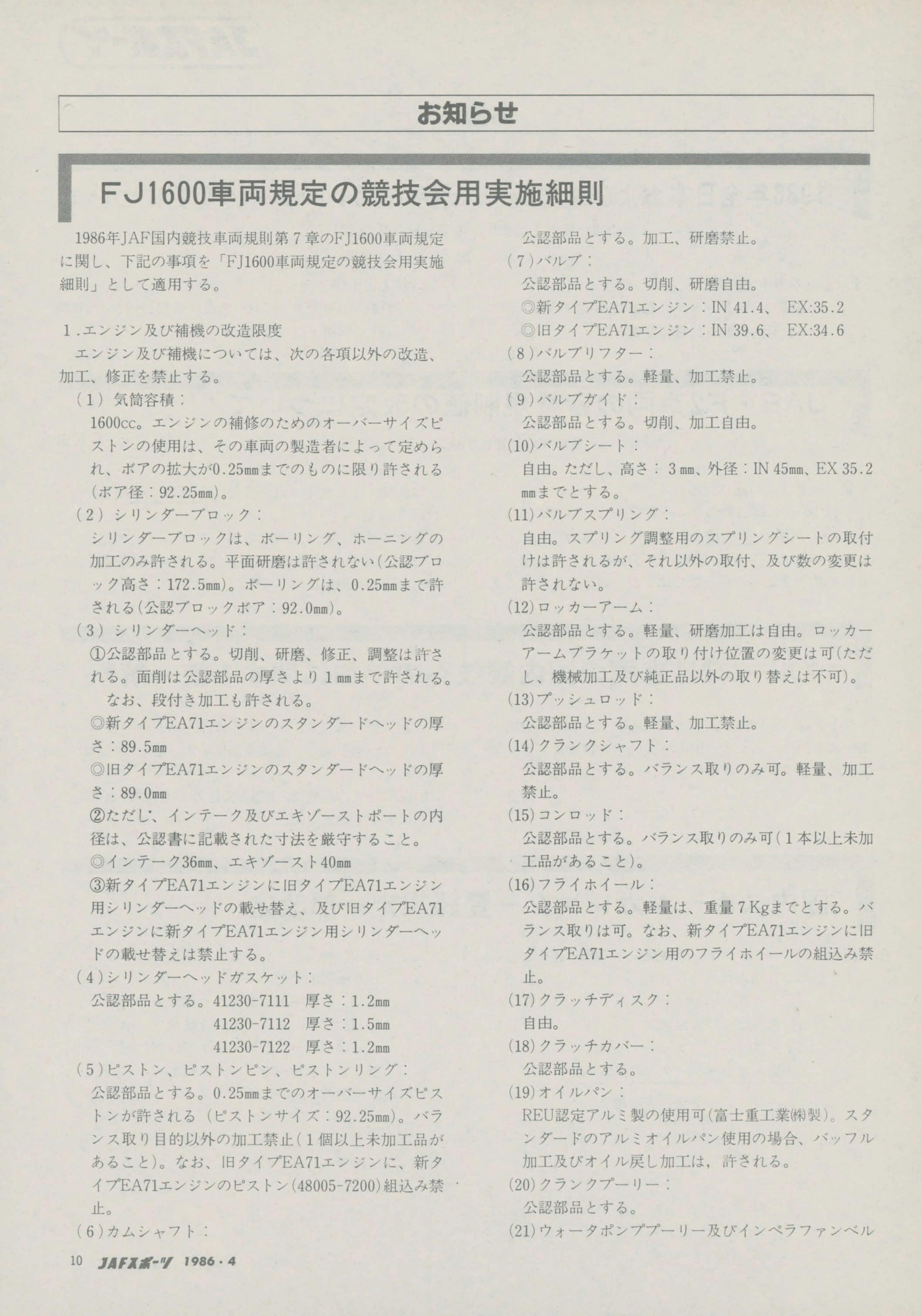 される公認部品のみとする。たたし、旋盤加 接、研磨などの機械加工を必要とする組合せは禁止。 ⑤新タイプエンシンに旧タイプエンジン用のミ・/シ ョンギア及びデフギアの載せ替え禁止。