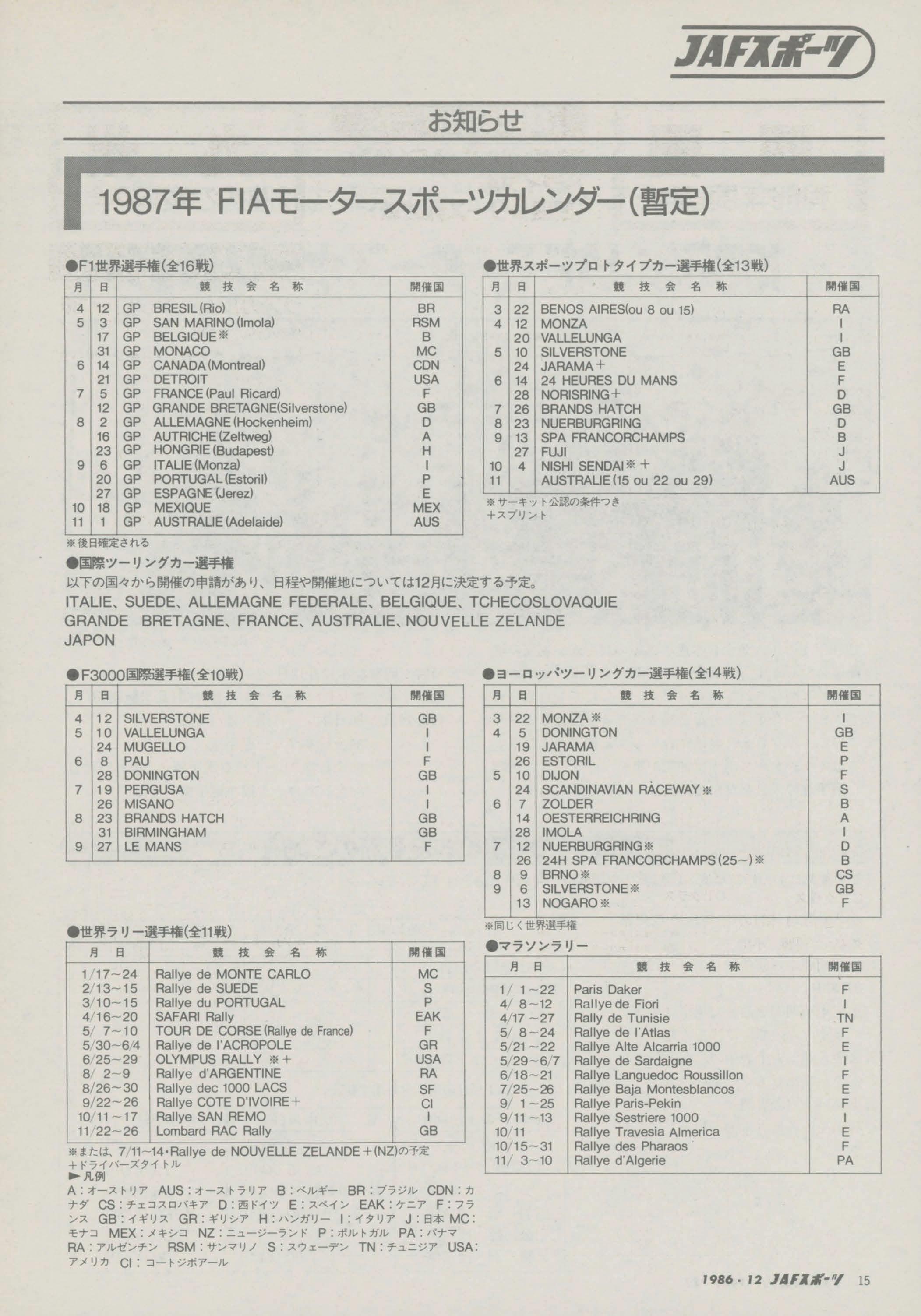 3 22 4 5 DONINGTON 19 JARAMA 26 ESTORIL 5 10 DIJON 24 SCANDINAVIAN 6 7 ZOLOER 14 OESTERREICHRING 28 IMOLA 7 12 26 24HSPAFRANCORCHAMPS 8 , BRNO* , 6 13 1 1-22 ParisDaker 4/8-12 RallyedeFiori 4/17-27 RallydeTumsie 5/8-24 Rallyede!'Atlas 521-22 RallyeAlteAlcarria1000