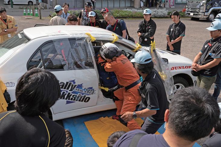 技の解説に加えて、実際の競技車両への子供たちの着座体験 が行われた。最後には、ロードサービス隊員が本番さながらの 手際で実施する横転車両の引き起こしを全員で見学。集合写 真撮影後に解散となった。