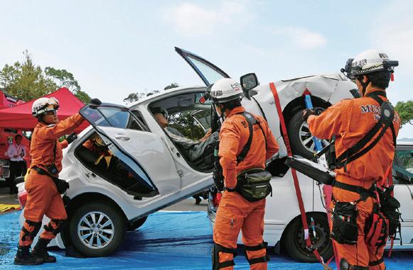 現役ロードサービス隊員による横転車 両の引き起こしは、最後に用意されたプ ログラム。真剣に取り組む隊員の手際 に参加者から拍手が湧いていた。
