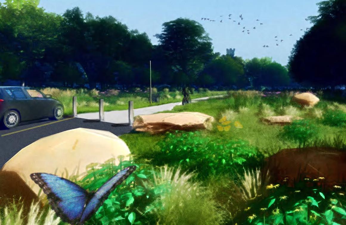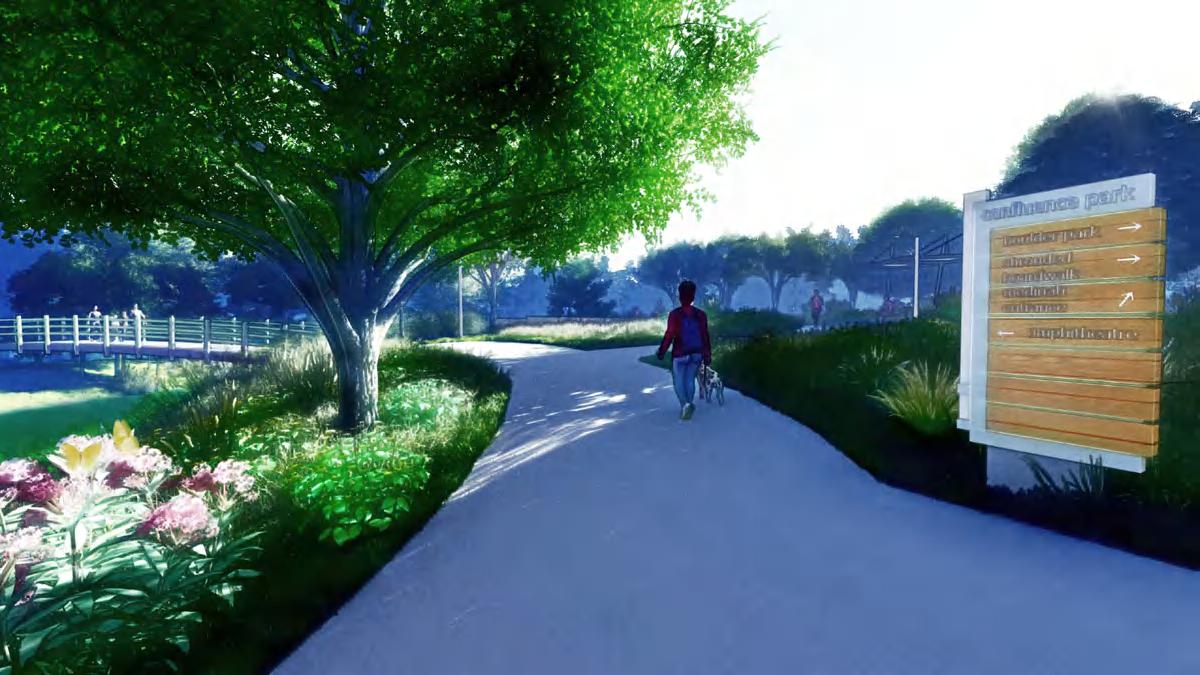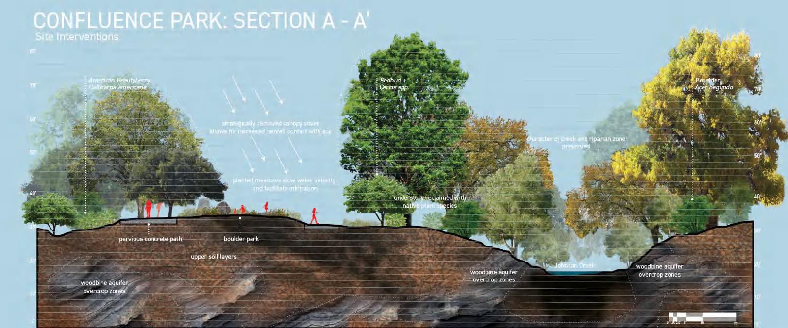 The design for Confluence Park creates an accessible sequence that links the surrounding communities to the isolated interior of the site. The park's permeable paths flow alongside Johnson Creek's banks, at times crossing the stream at curated views, at other times pausing at observation decks furnished with educational signage detailing the history, ecology, and geology of the site. Urban meadows and phytoremediation corridors provide aesthetic and ecologic value while increasing rainwater infiltration, reducing creek erosion, and purifying stormwater. Programming elements such as a boulder park and amphitheatre create additional spaces for community engagement.