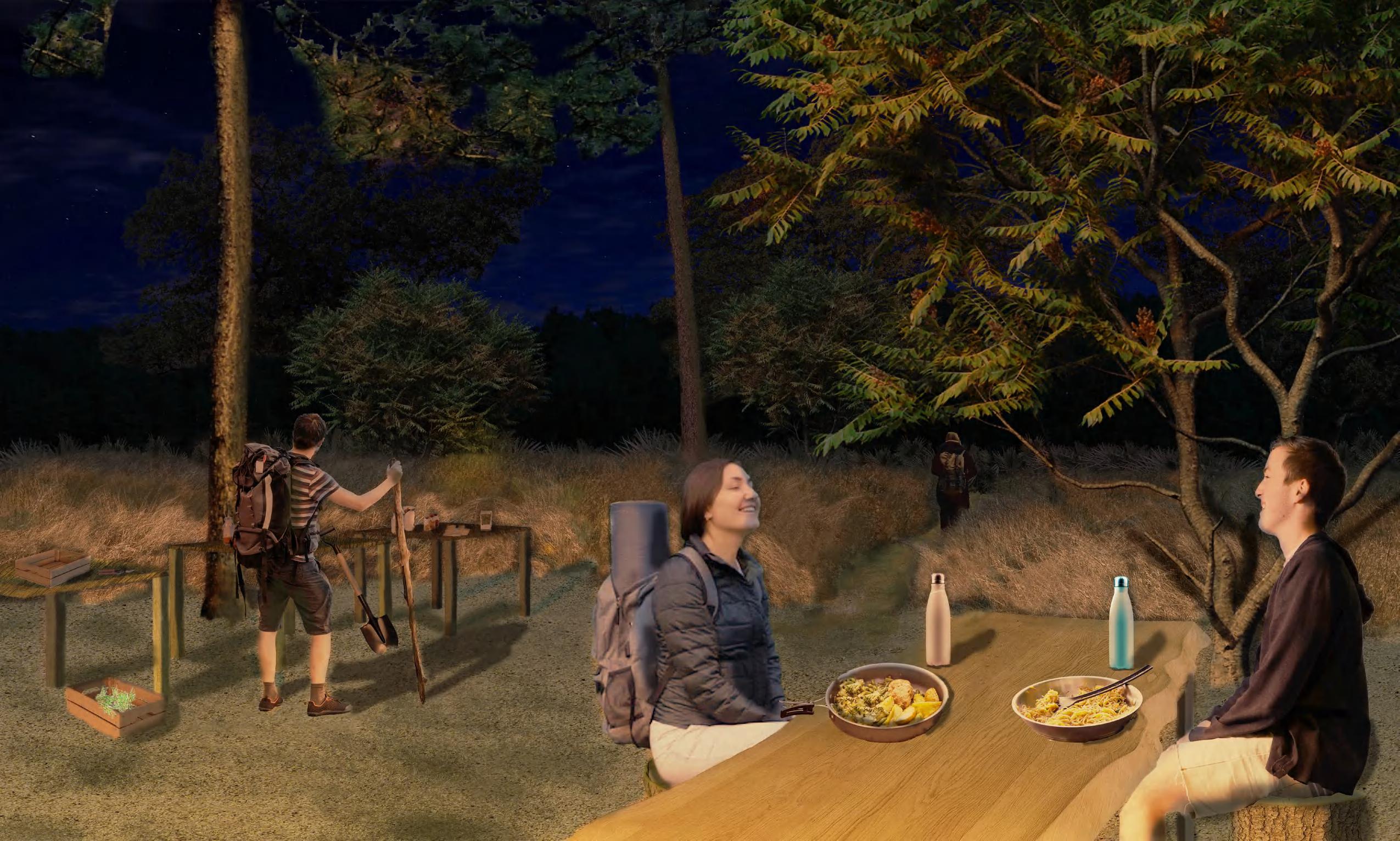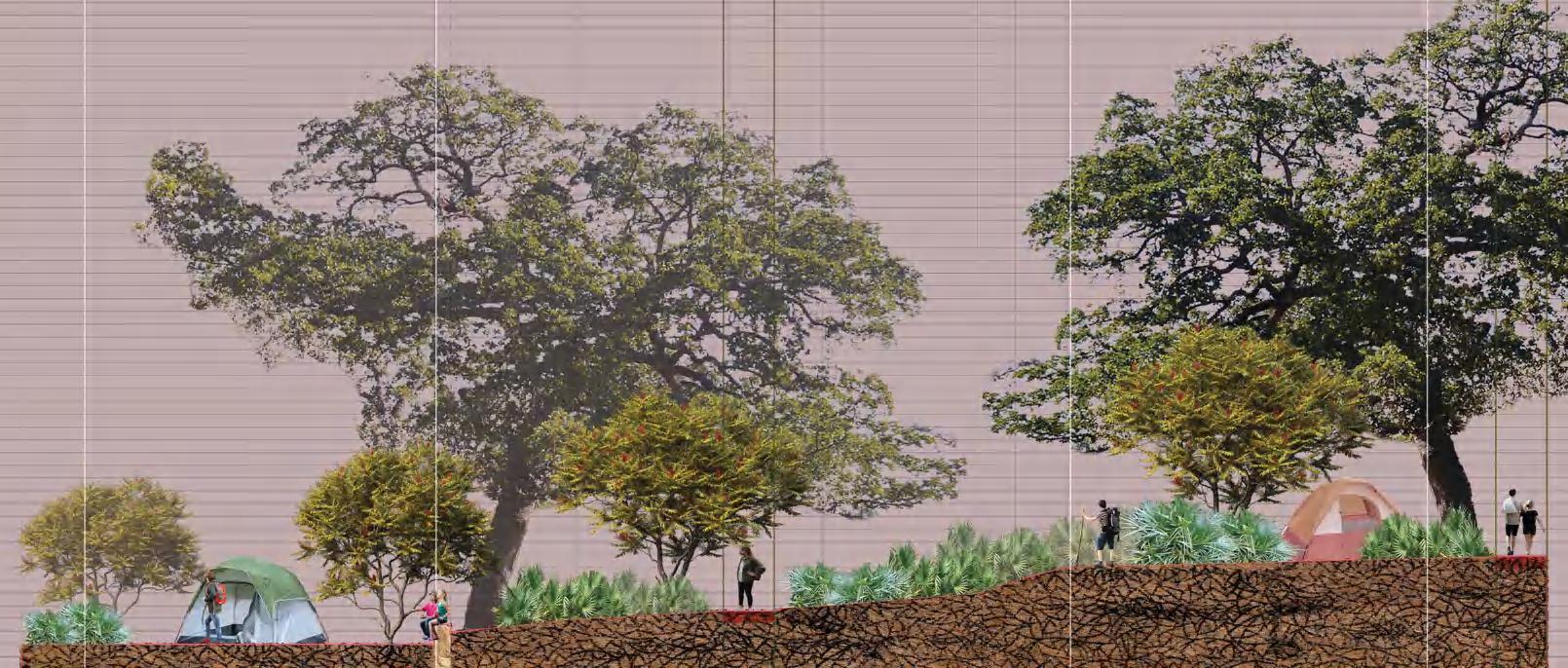 Along with designing a trail for day use, part of this project addresses creating a space for night use. The "Wooded Basilica" is a large campsite that explores the relationship between topography, plant communities, and space. This site flows along the side of a hill surrounded by a basilica of lowland forest. The public, uppermost portions feature finely textured plants that orchestrate panoramic views of the site. The lower portions house intimate spaces formed by the hill and by plants with low, dense, opaque spatial qualities. The trails mimic the site's fluid topography, while the campsites showcase key views marked during site visits.