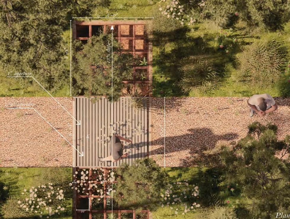 Strategic extensions of campsite grade create curated viewing rooms Seatwalls call back to terraced effect of pathing while also responding to existing topography Paths create small terraces that create brief moments of prospect Dense plantings of needle palm conceal space 0.5’ 4’ 1/4 in Campsite footprint Campsite footprint Winged sumac Path Path Rhus copalliunum Needle Palm Rhaphidophyllum hystrix Post Oak Quercus stellata 0.5’ 2’ 1/4 in ft Campsite footprint Winged sumac Gathering site footprint Descent corresponds with increased enclosure and privacy Path Path Rhus copalliunum Little Bluestem Schizachyrium scoparium Needle Palm Rhaphidophyllum hystrix Post Oak Quercus stellata Longleaf Pine Pinus palustris Ascent corresponds with decreased enclosure and privacy Low branching and dense habit of post oak and sumac create intimate enclosure High. thin canopy of pines subtly suggests enclosure Bluestem creates sense of movement which aids in defining gathering space 16 cultivating attunements: tuskegee national forest A' A B' B