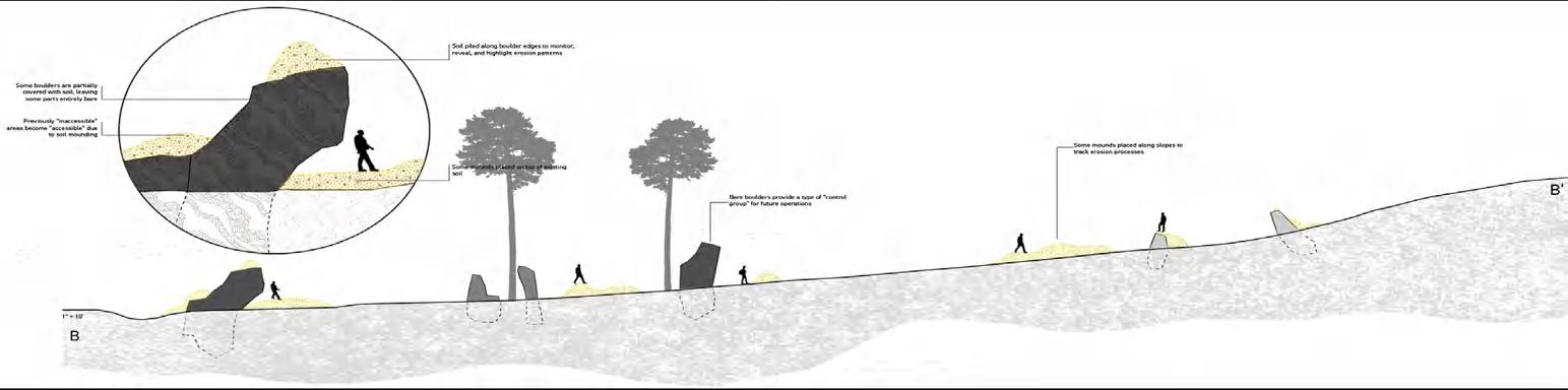 The defining theme of this project centers around the creation of microclimates and the subsequent differentiation of plant species that results from microclimate conditions. The installation of sandstone boulders across the site (Operation 1) simultaneously creates opportunities for human experience (compression/ relief, ledges, overhangs, etc) and the foundation for microclimate instances. Areas of soil deposition in Operation 2 reveal additional nuances in light, topography, and existing soil types. Operation 3 initially follows the compression and relief system of Operation 1 but over time reveals the niches created by both Operations 1 and 2 as the grass seed mix spread and differentiate in unexpected ways across the site. theoretical study: