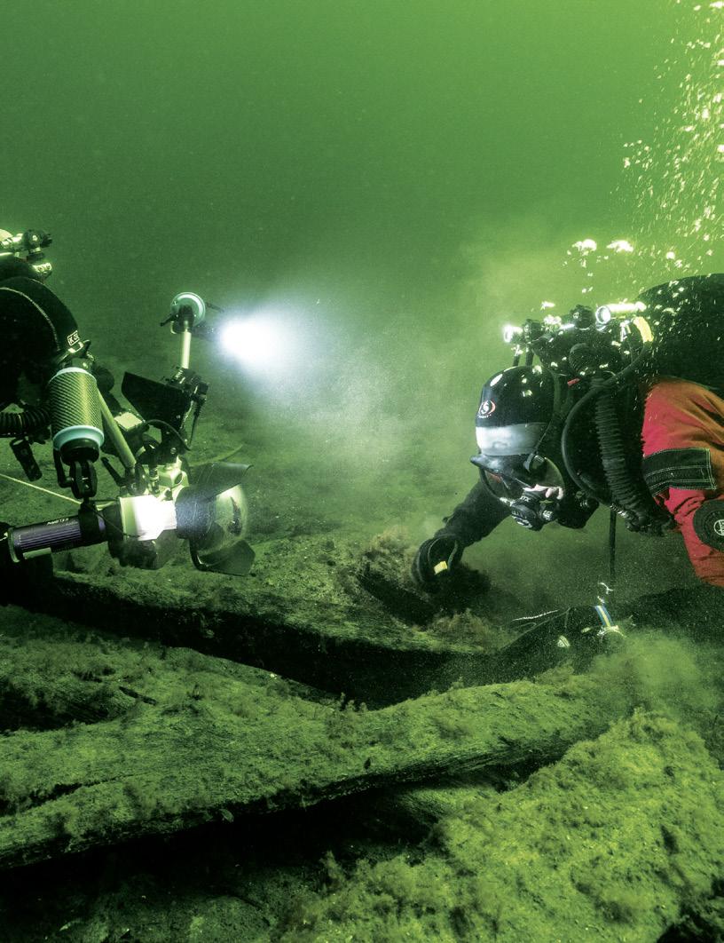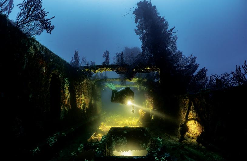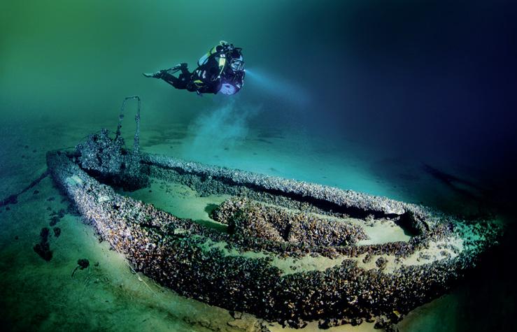 The wreck stands upright at a depth of 84 metres. From a distance, it appears to be floating; up close, the details are striking: the wooden deck, the ornamental carvings, the chains hanging from the bow. As the photographer and his model search for the perfect shot, time flies by. The bow becomes the most striking image – and the photograph that ultimately clinches victory in the competition.