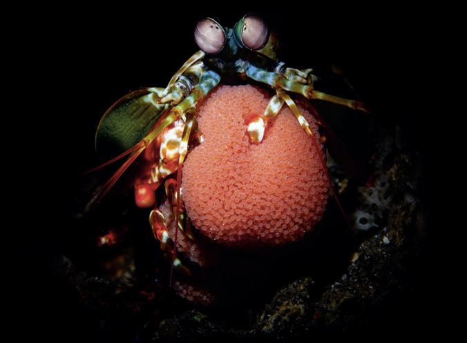 TAUCHEN says: Brilliant subject, razor-sharp. The framing is spot on. The exposure is perfect, and the post-processing is almost picture-perfect. The vignetting could have been a little wider to reveal a few more details. A fantastic close-up and wide-angle view of a mantis shrimp with its eggs – beautifully done.