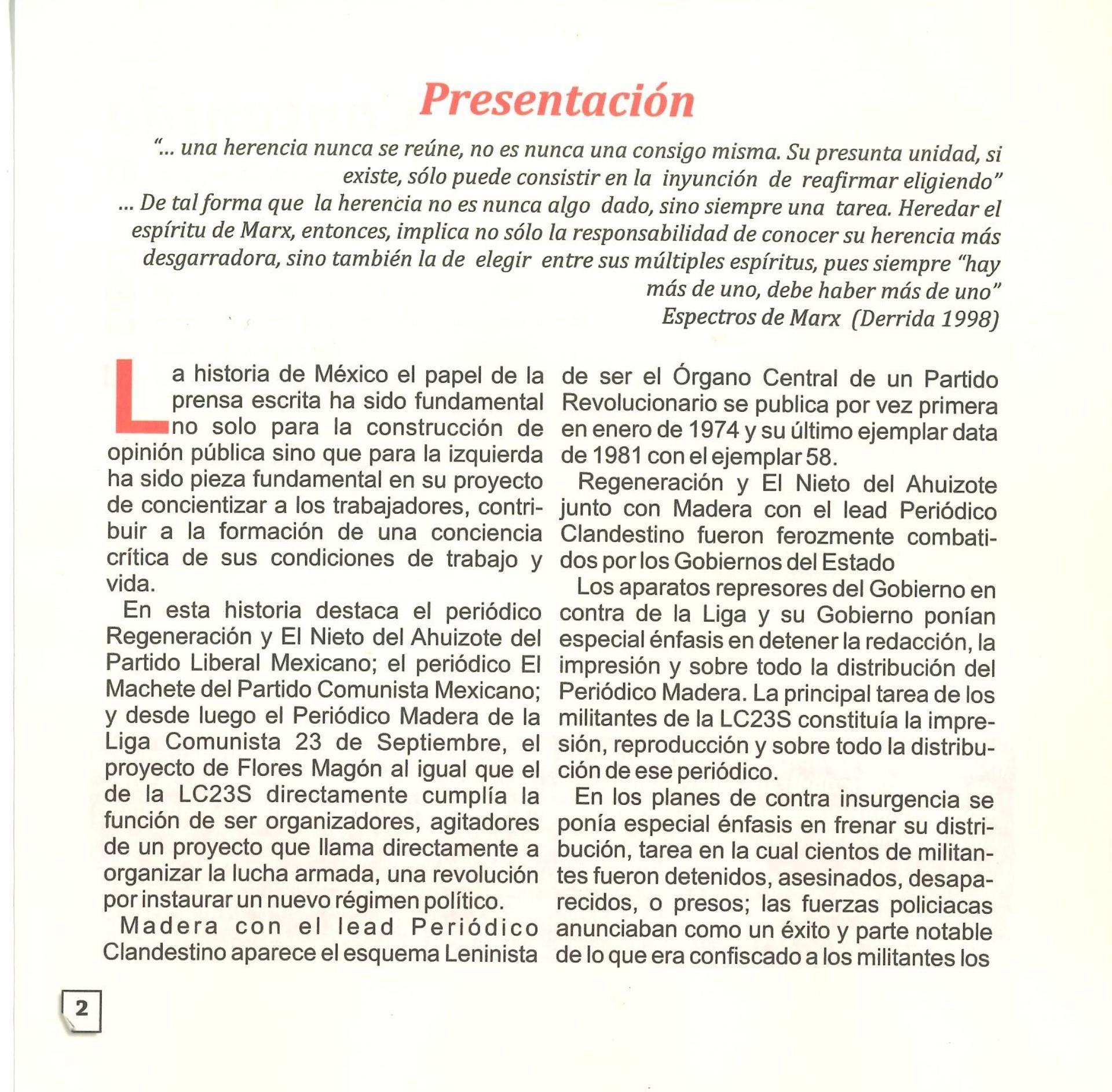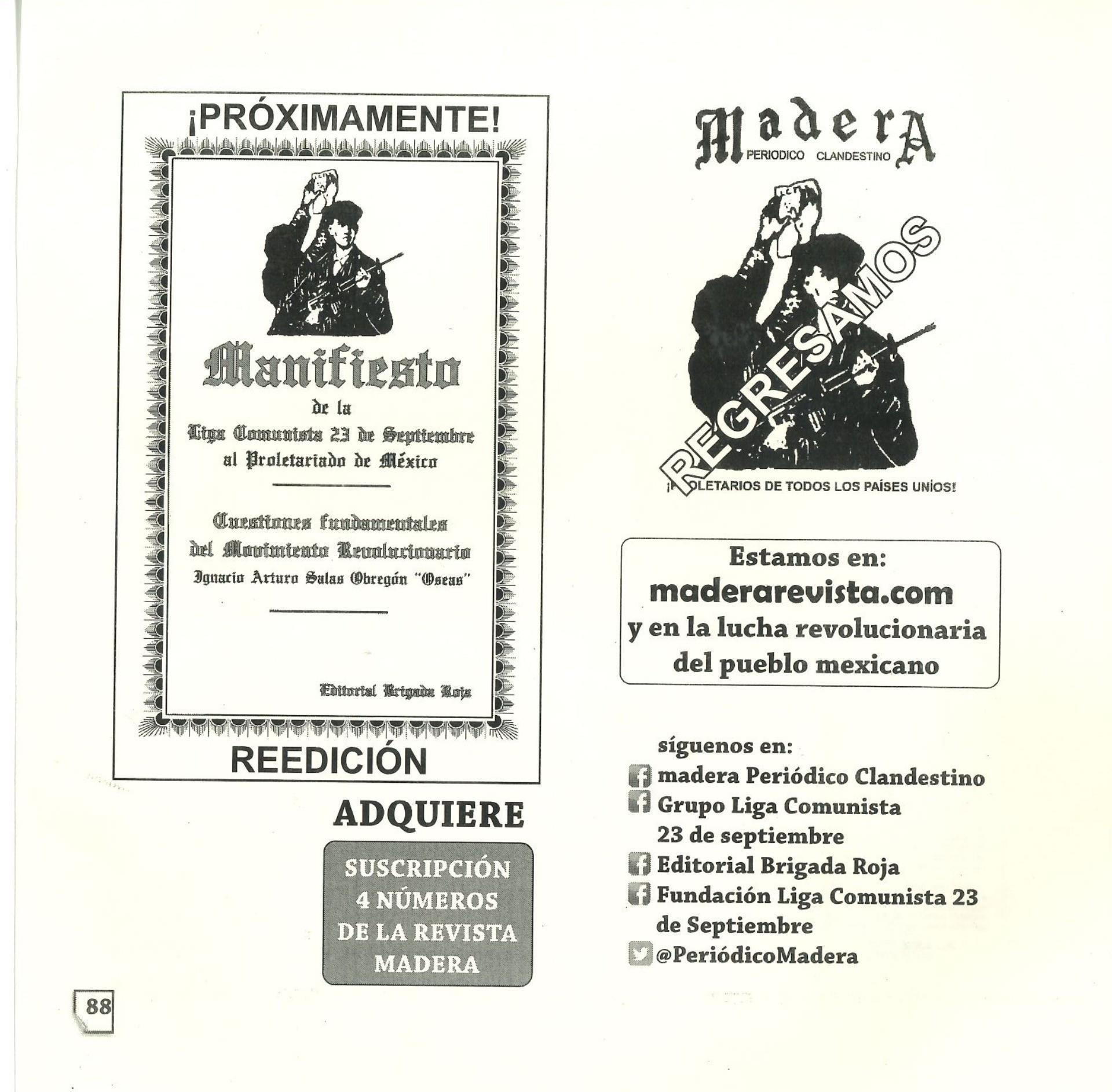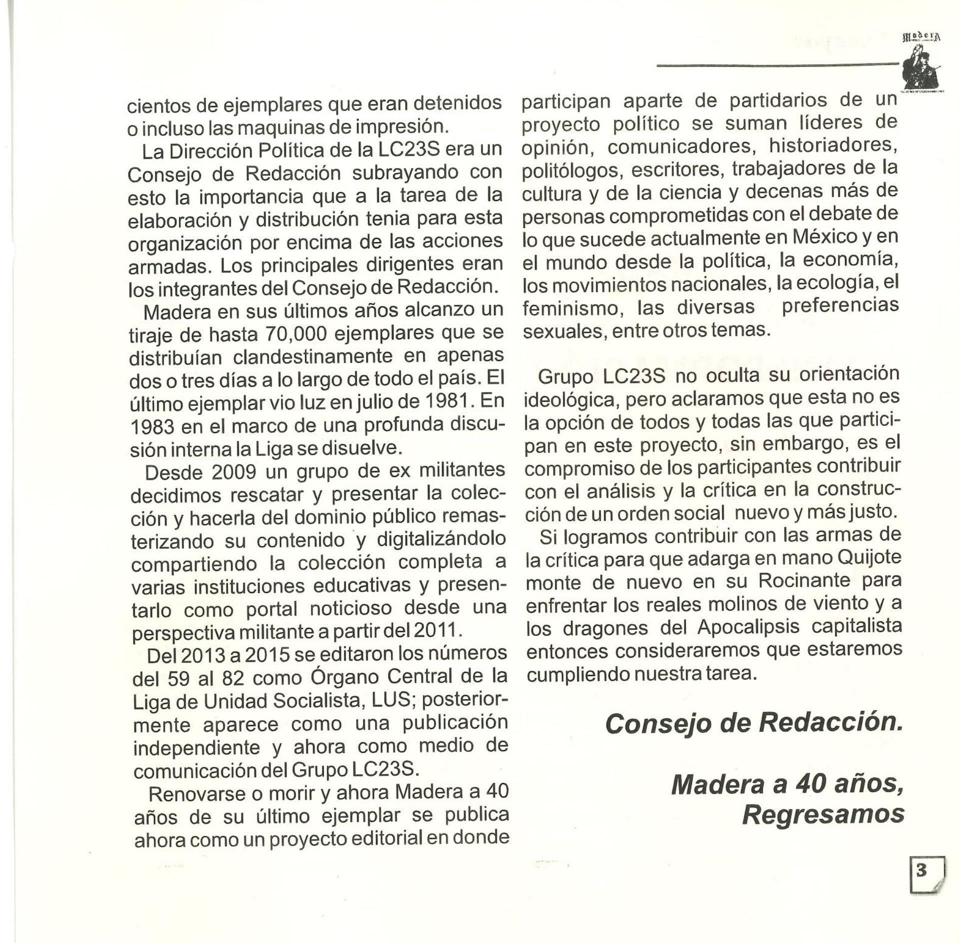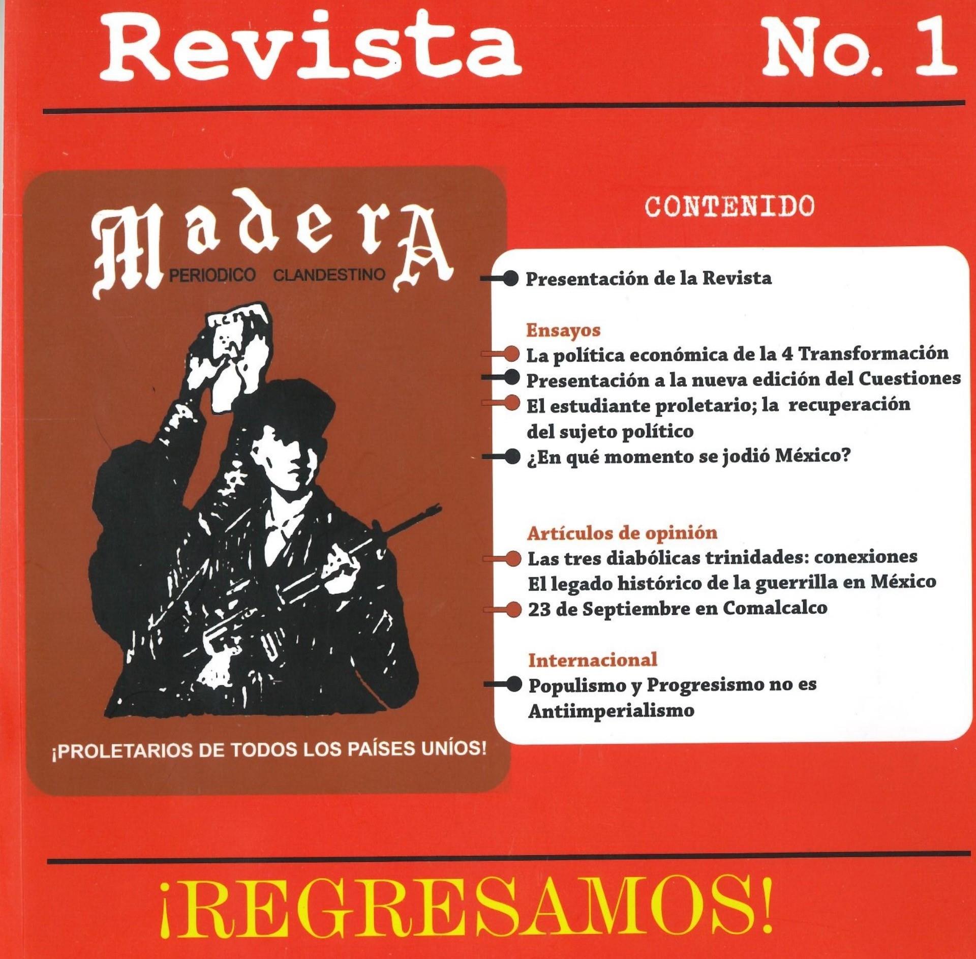Madera Periódico Clandestino ahora Revista originalmente publicada por la Liga Comunista 23 de Septiembre; ahora por el Grupo del mismo nombre; los artículos son responsabilidad de sus autores en cuento a sus opiniones, nuestro compromiso es contribuir al debate desde la izquierda socialista; ejemplar 1 primer época publicado enero 1974; desde 2009 se publico en portales en internet, ahora a partir de 2022 estará de vuelta impreso