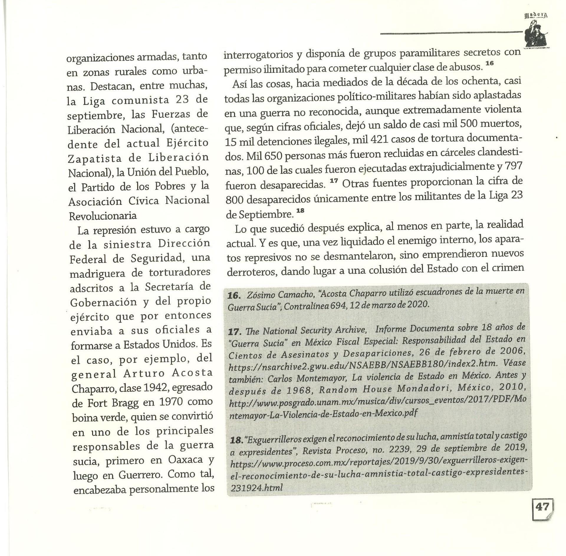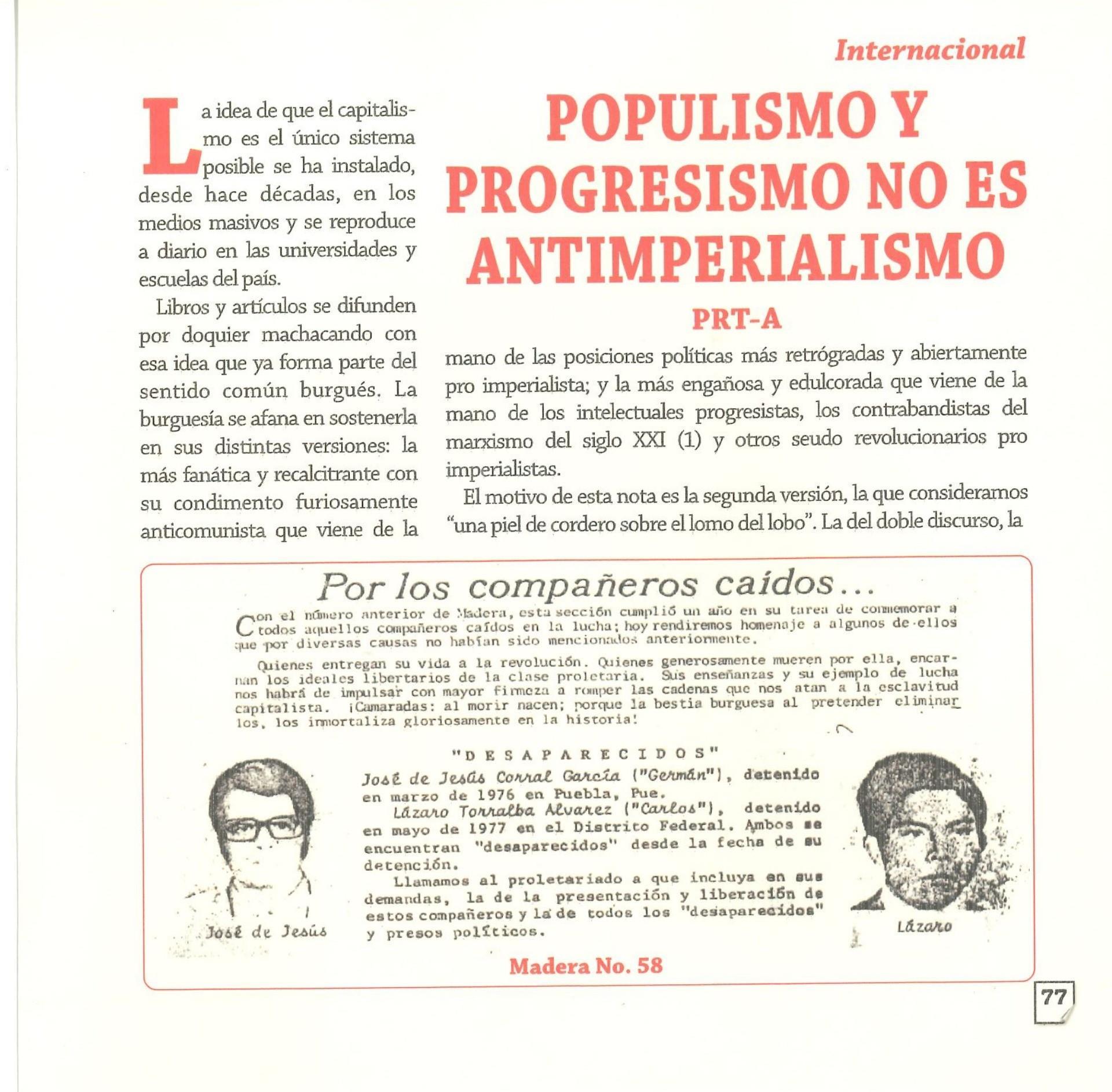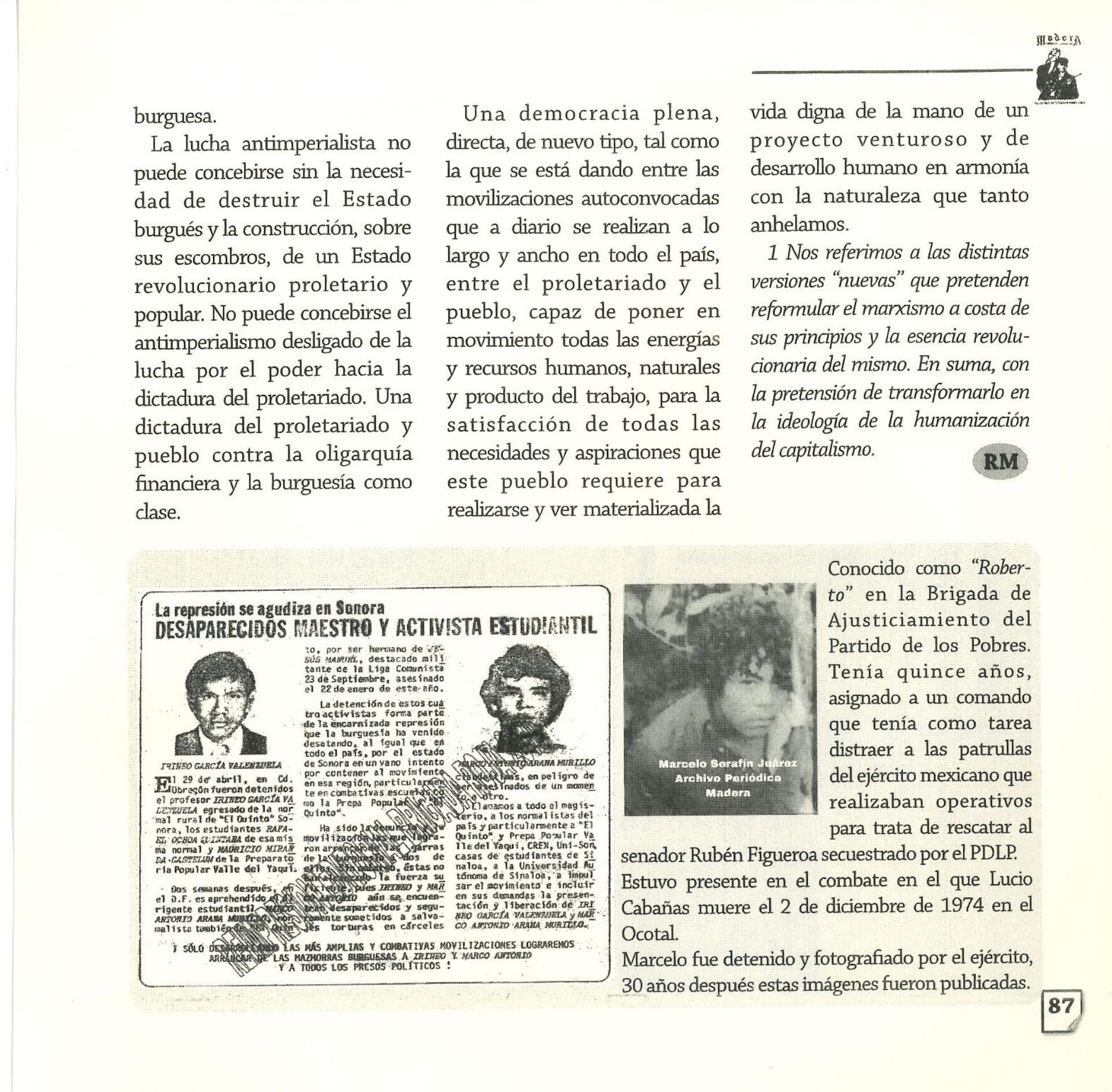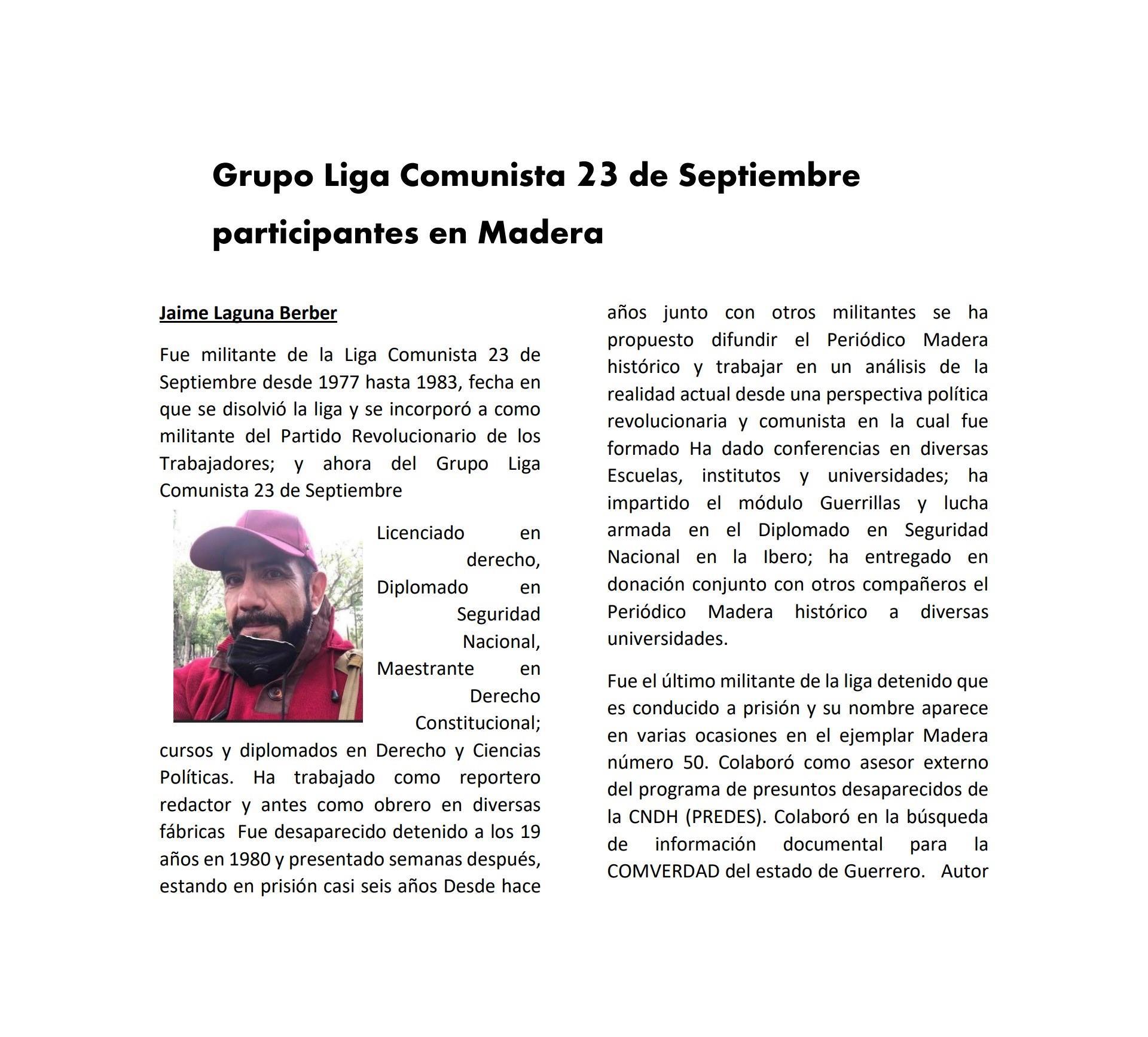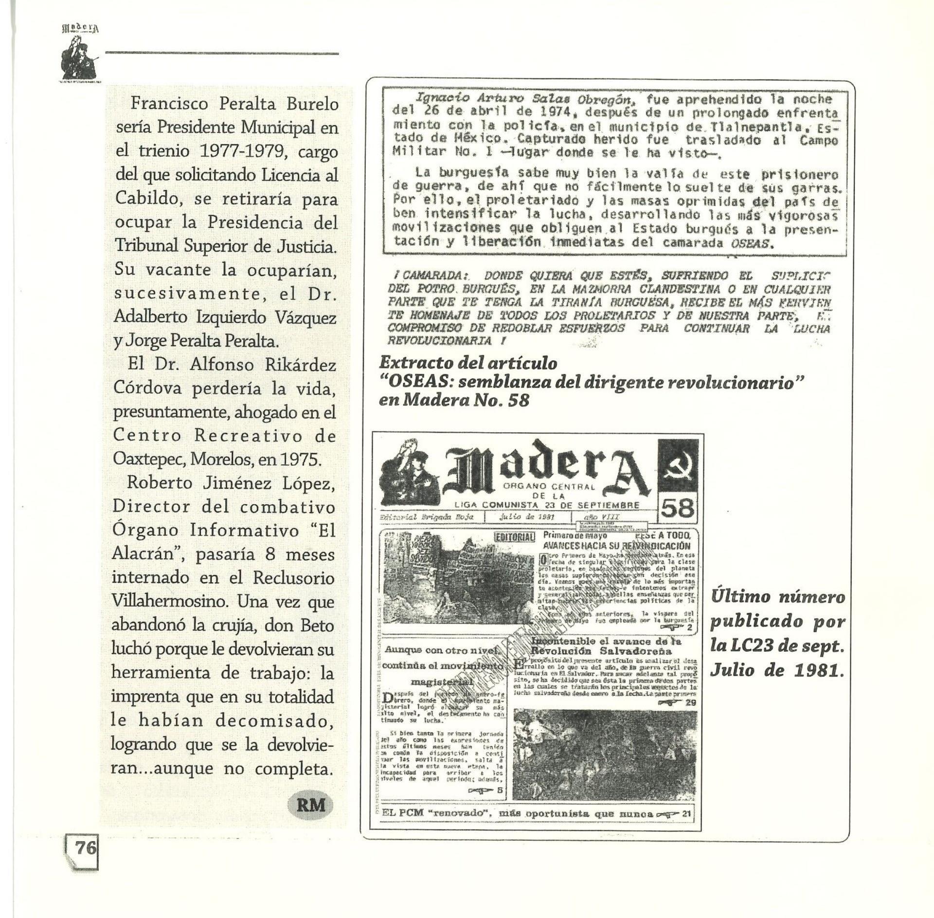 Madera Periódico Clandestino ahora Revista originalmente publicada por la Liga Comunista 23 de Septiembre; ahora por el Grupo del mismo nombre; los artículos son responsabilidad de sus autores en cuento a sus opiniones, nuestro compromiso es contribuir al debate desde la izquierda socialista; ejemplar 1 primer época publicado enero 1974; desde 2009 se publico en portales en internet, ahora a partir de 2022 estará de vuelta impreso