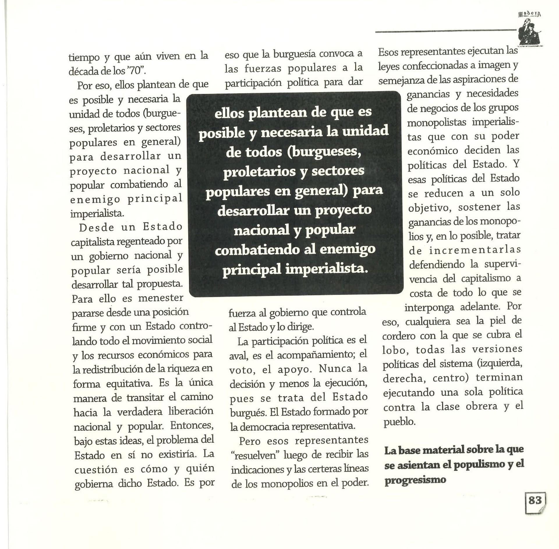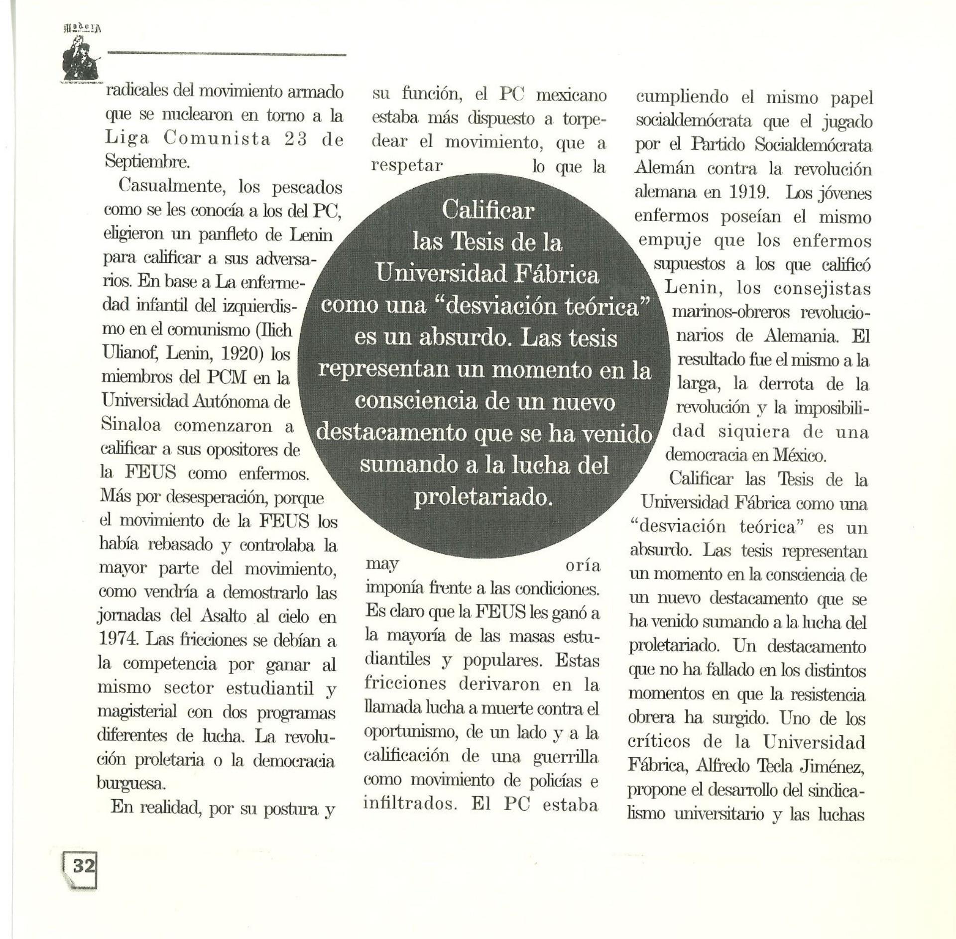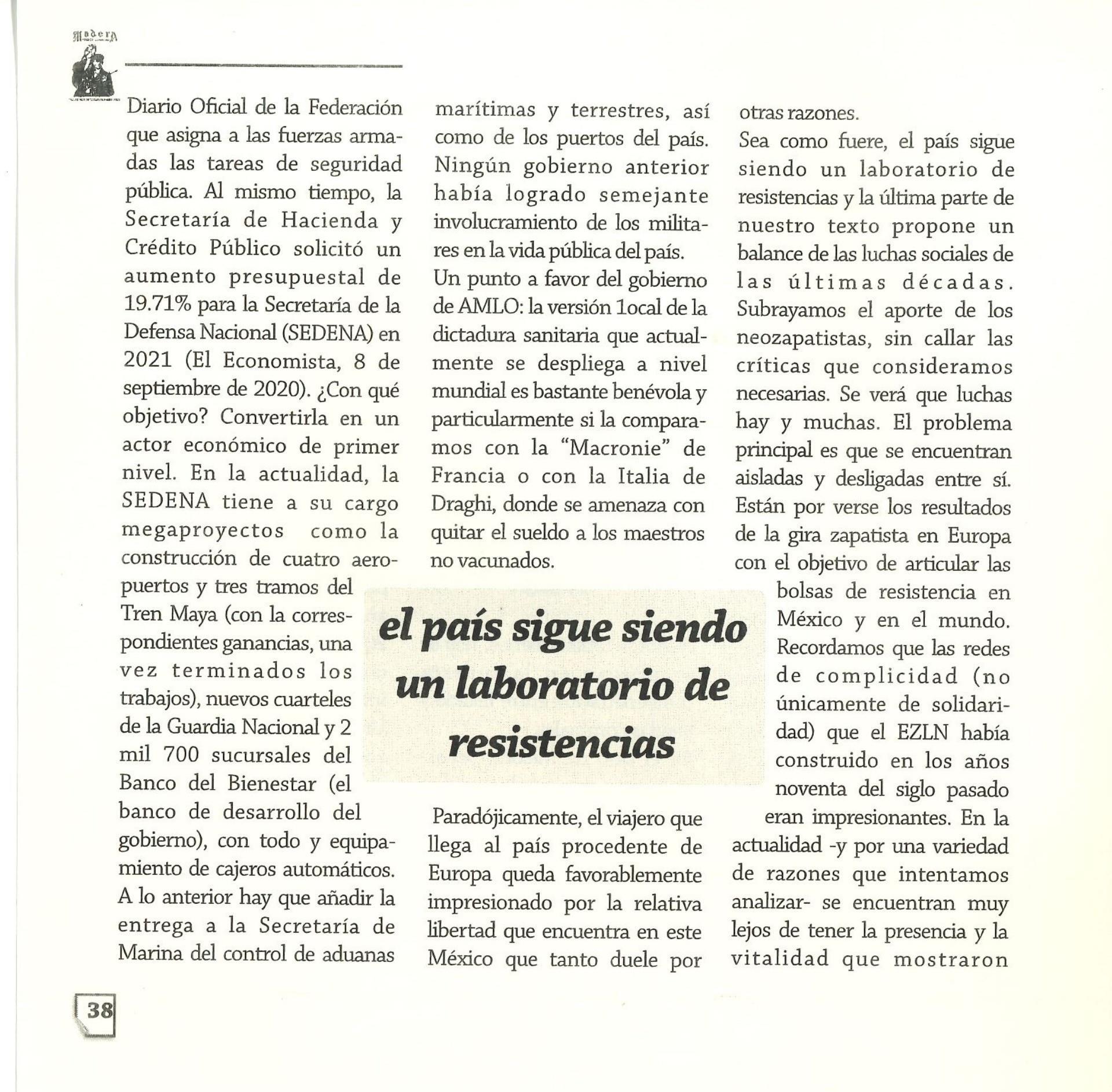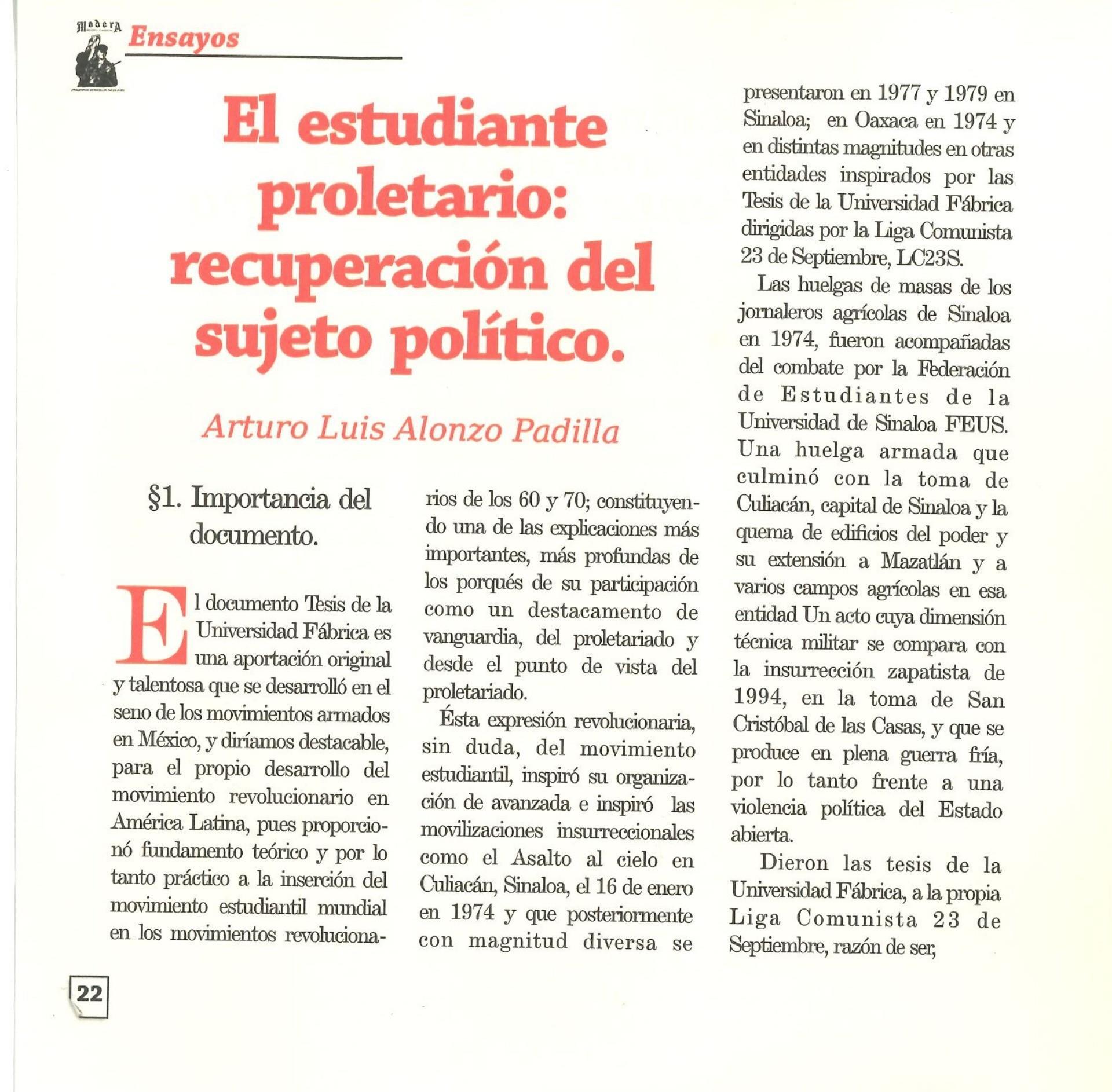 Madera Periódico Clandestino ahora Revista originalmente publicada por la Liga Comunista 23 de Septiembre; ahora por el Grupo del mismo nombre; los artículos son responsabilidad de sus autores en cuento a sus opiniones, nuestro compromiso es contribuir al debate desde la izquierda socialista; ejemplar 1 primer época publicado enero 1974; desde 2009 se publico en portales en internet, ahora a partir de 2022 estará de vuelta impreso