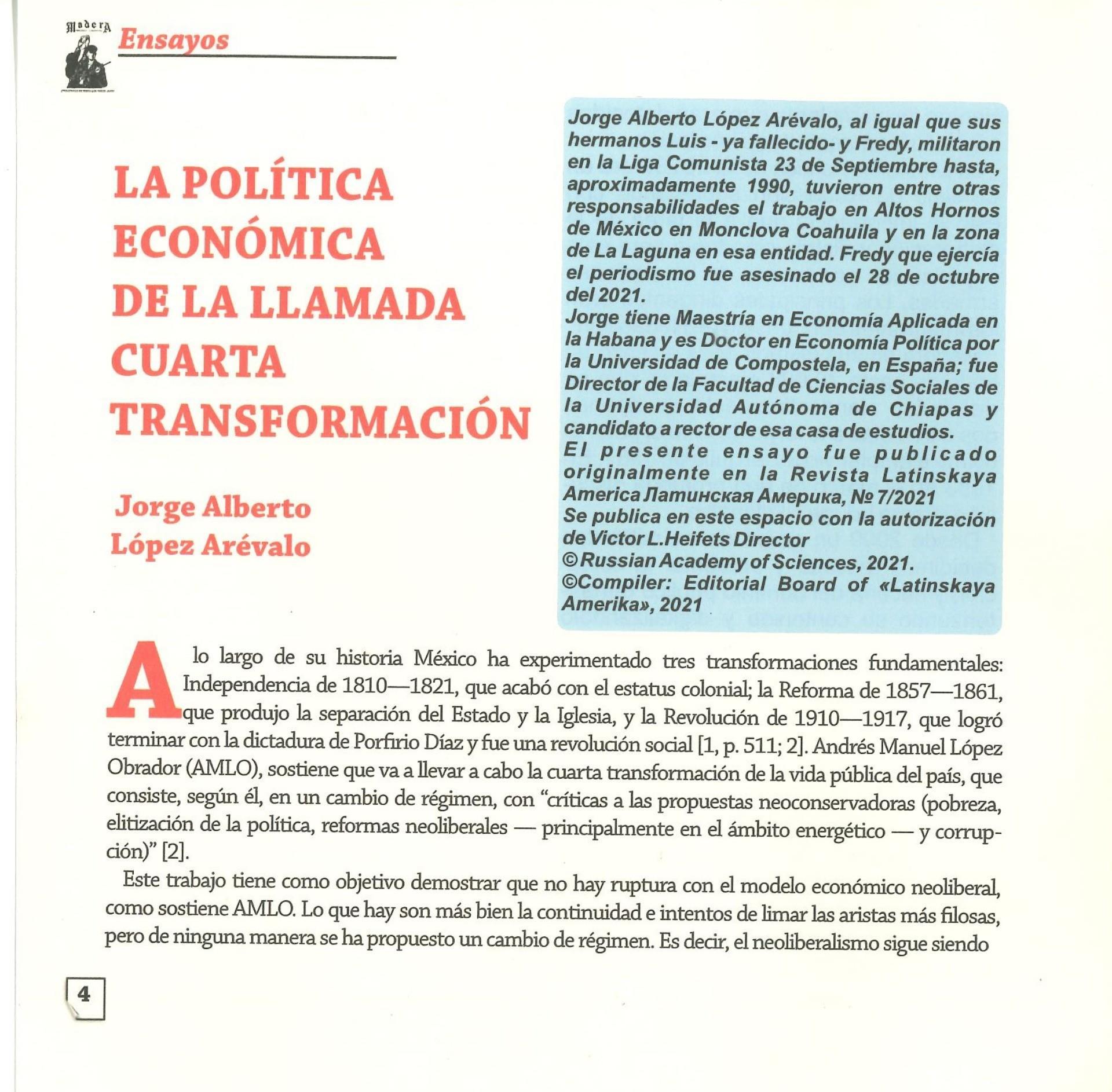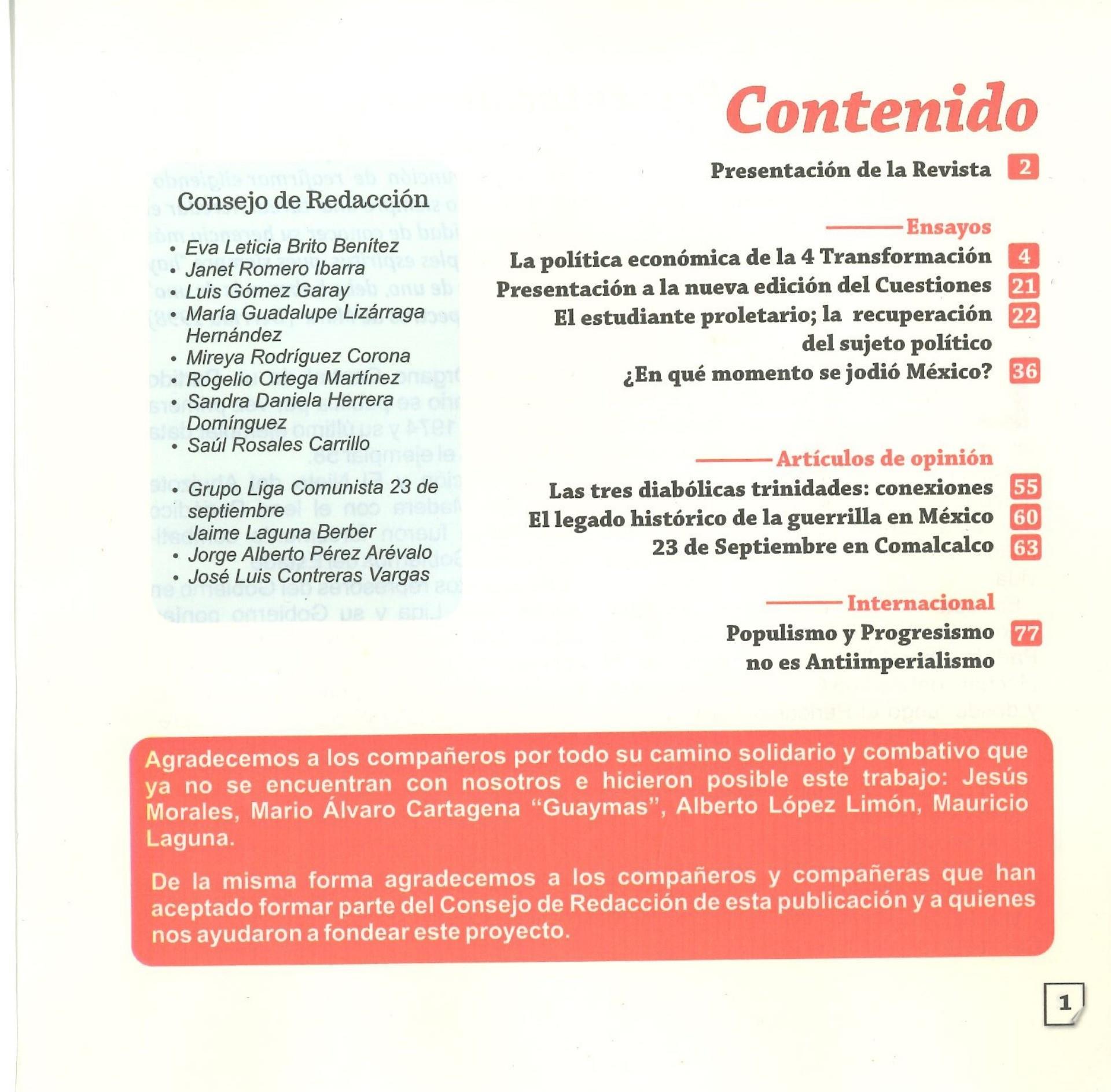 La Política económica de la 4aTransformación, Jorge López, Presentación a la nueva edición de Cuestiones, por la Redacción; El estudiante proletario; la recuperación del sujeto político por Arturo Alonzo; ¿En qué momento se jodió México? Fabiana Medina y Claudio Albertani; Las tres diabólicas conexiones, Ramsés Ancira; El Legado histórico de la guerrilla en México, Jaime Tamayo; 23 de septiembre en Comacalco, Antonio Zárate de la Fuente; Populismo y Progresismo no es antiimperialismo, PRT-A