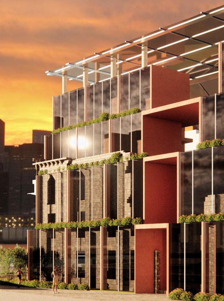 Utilizing different materials to form angular forms inspired by the urban fabric and materiality of the site