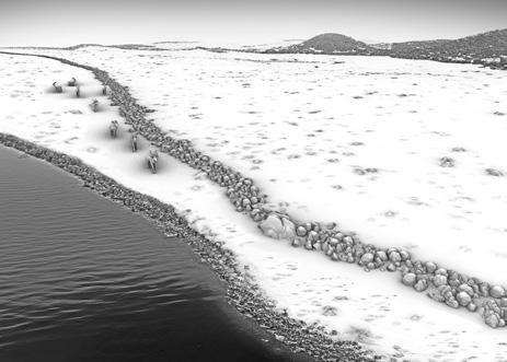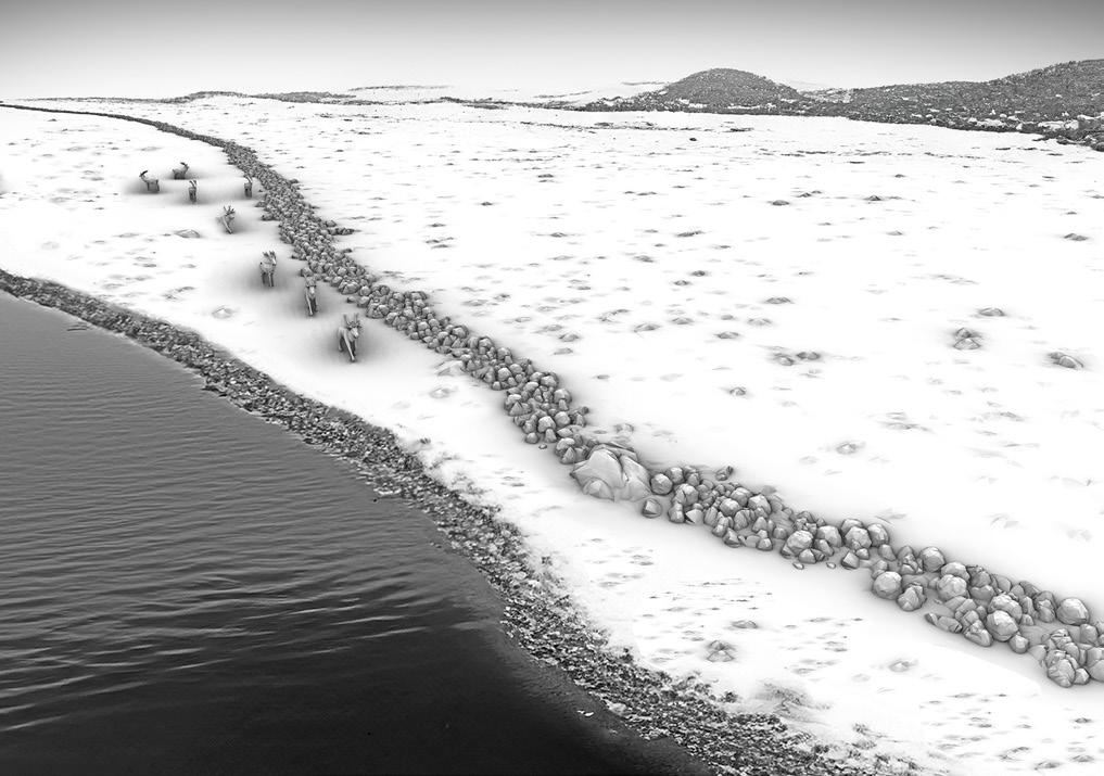 Graphical reconstruction of the stone wall discovered at the bottom of the Baltic Sea as a a drive hunting structure, based on bathymetric data and an underwater 3D model © Grabowski