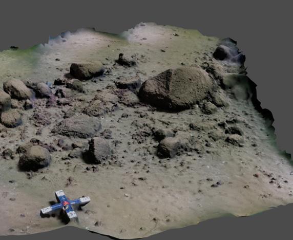 3D model of a section of the stone wall (scale, bottom edge of image: 50 cm). The tennis ball to football-sized stones that form the approximately 1 km long wall are clearly visible. @ Auer, LAKD M-V