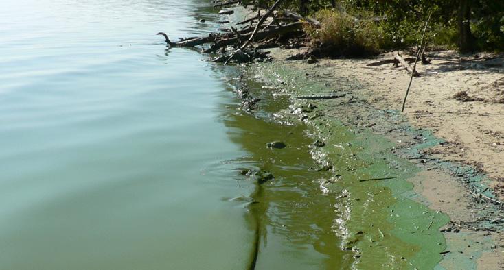 In the Baltic Sea, excess nutrients entering through surface runoff and rivers (86) of which originate from agriculture promote cyanobacteria blooms that would not occur naturally at such levels. Other microalgae species are displaced by them. Due to their shape and size, filamentous blue-green algae cannot be eaten by small crustaceans, which are an important food source in marine food webs. Instead of eating a vegetarian diet, the smallcrustaceans eat microbes/bacteria that feed on excrement or decomposition products from bluegreen algae.