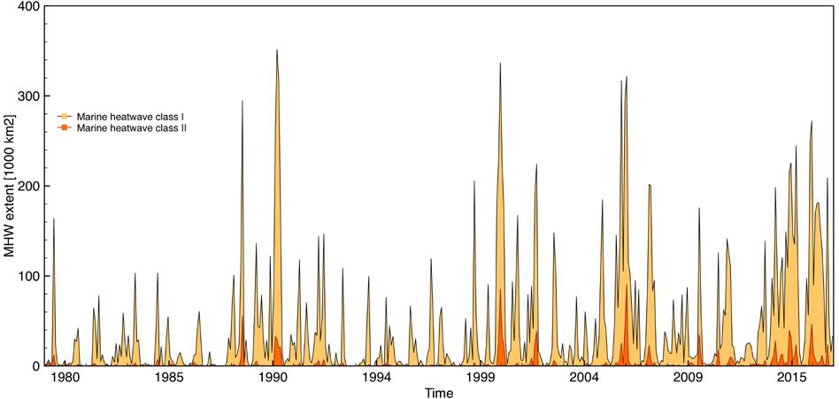 Average annual surface extent of marine heatwaves in the Baltic Sea. Yellow: moderate heatwaves. Red: severe heatwaves. @ IOW