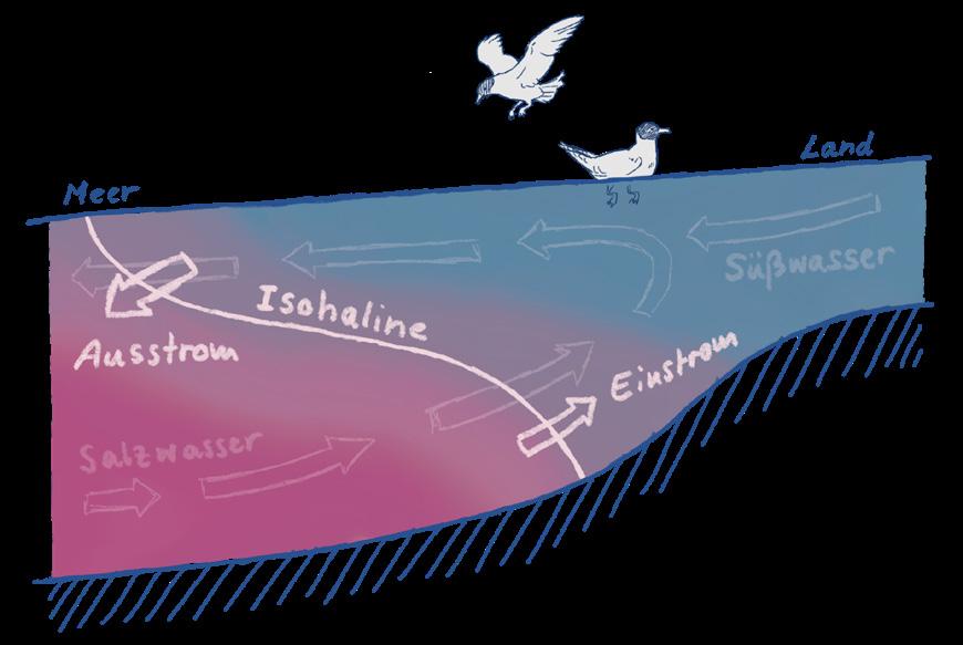 Longitudinal section through an estuary (sea on the left, river on the right). The arrows represent the estuarine circulation, in which the inflowing salt water (magenta) mixes with the fresh water (blue) and leads to a brackish outflow.
