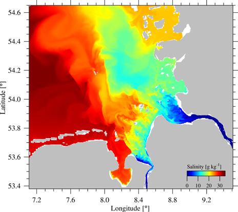 In order to investigate the relationship between mixing and estuarine circulation, variables such as salinity, currents and turbulence – which causes mixing – must be known in high temporal and spatial resolution. Since measurements alone cannot meet this requirement, researchers from the “Processes in Estuaries and Coastal Seas” working group at the IOW used highresolution computer simulations of the Warnow, Elbe and Pearl River to create maps showing where water exchange with the sea takes place in the estuary. It was found that this has a two-layer structure: on each area of constant salinity (i.e. “isohaline”), there is an inflow towards land near the bottom, in the upstream part of this area. At the other end, i.e. seaward near the surface, water flows through the iso-haline towards the sea.