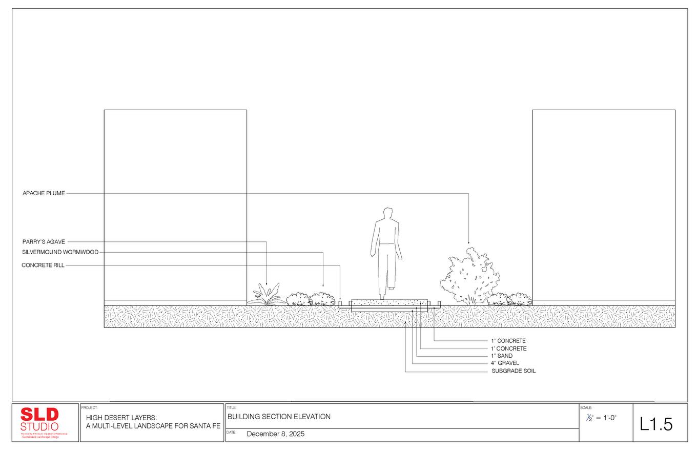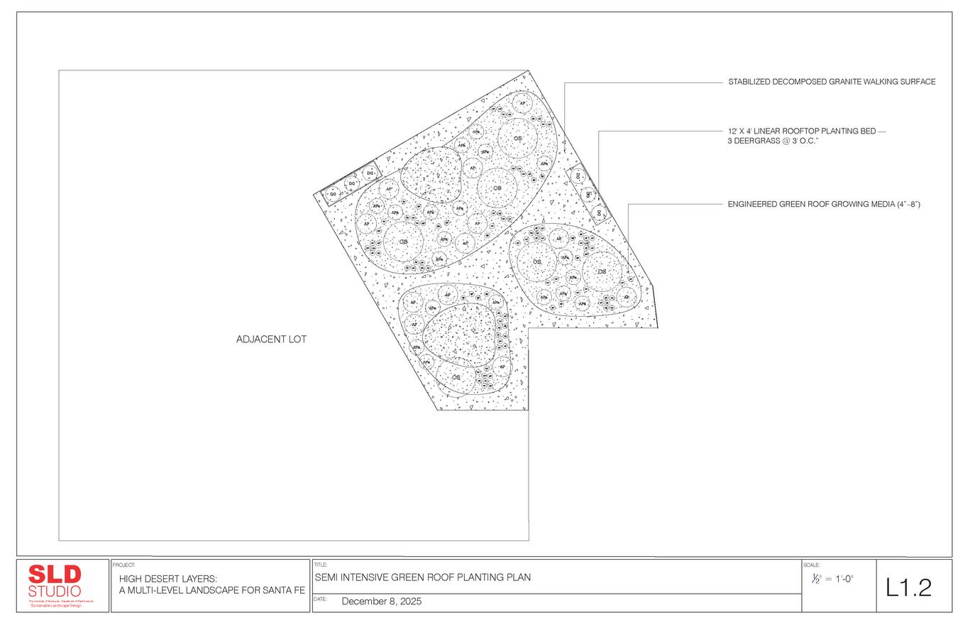 LAYERING AND HIGH DESERT SYSTEMS ACROSS ROOFTOPS AND ADJACENT GROUND IN SANTA FE, NM.