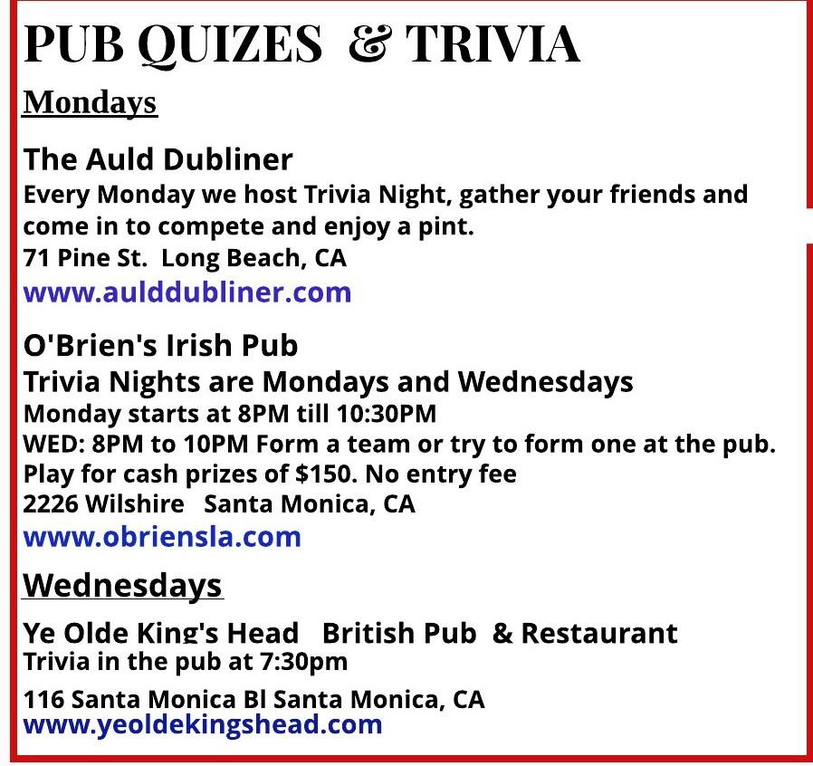 You're invit ed. Join t he craic and get t oget her w it h a great bunch of folks and share your love of Ireland and all t hings Irish. Breakfast s are very good t oo! Breakfast at 9.30 am Kenos Rest aurant 2661 West La Palm a Anaheim More info & t o get on t he m ailing list : PETE WALSH pbeireanua@at t net 1 714-200-7365 TRIVIA FANS. w e have a few list ings for w eekly Trivia Cont est s at pubs in SoCal on page 36. We are expanding t he list ings so if your favorit e cont est is not t here, please send us t he inform at ion t o us: jim @pubguide.com Com ing t o Sant a Barbara on St Pat rick's Day!!!